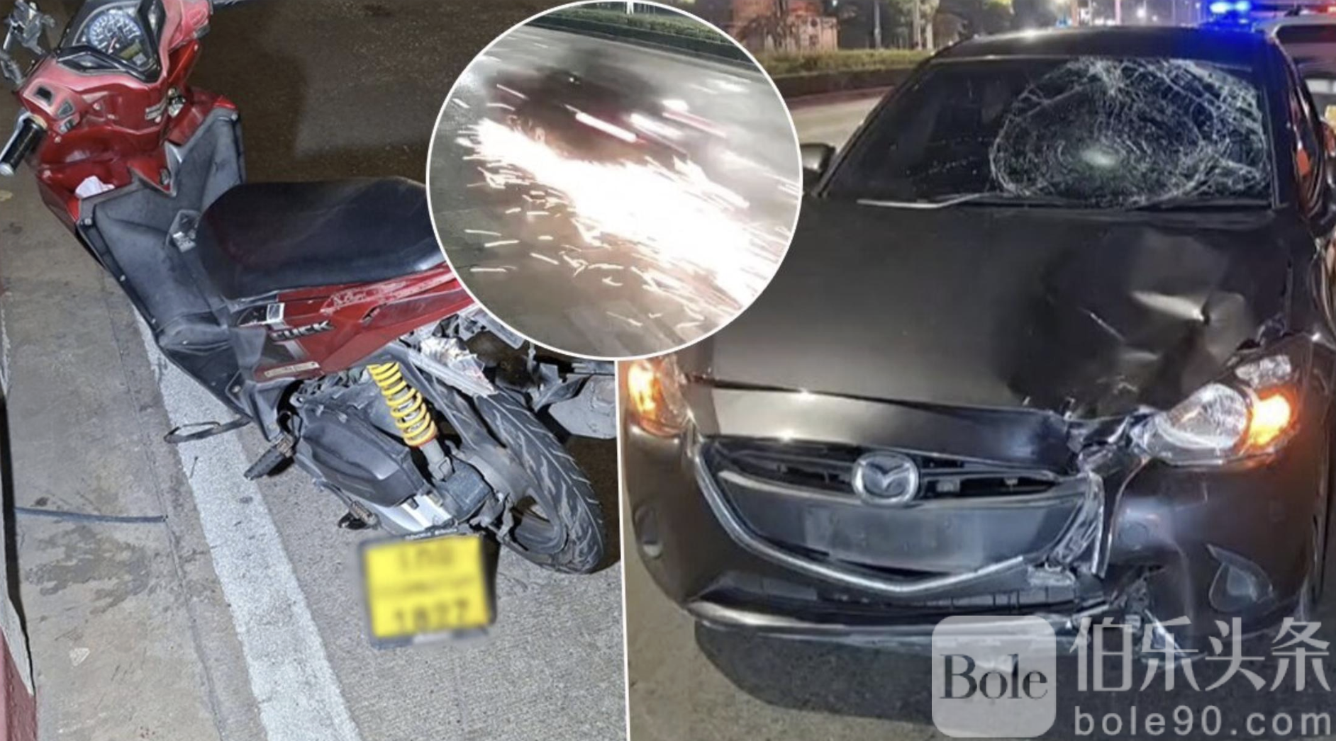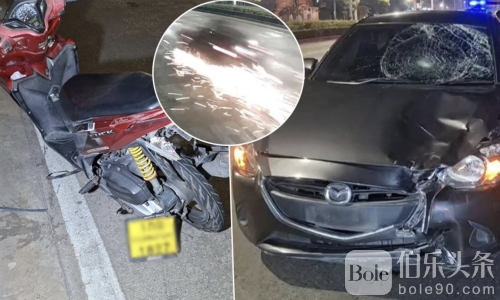 伯乐头条专讯:泰国曼谷邦坤天海路近日发生严重交通事故,一名酒后驾驶男子驾驶马自达2轿车,高速撞上前方摩托车,导致摩托车女乘客当场死亡,摩托车司机重伤。事故发生时,摩托车被拖行超过100米,撞击产生火花并引发小火,现场惨烈,引发社会广泛关注。