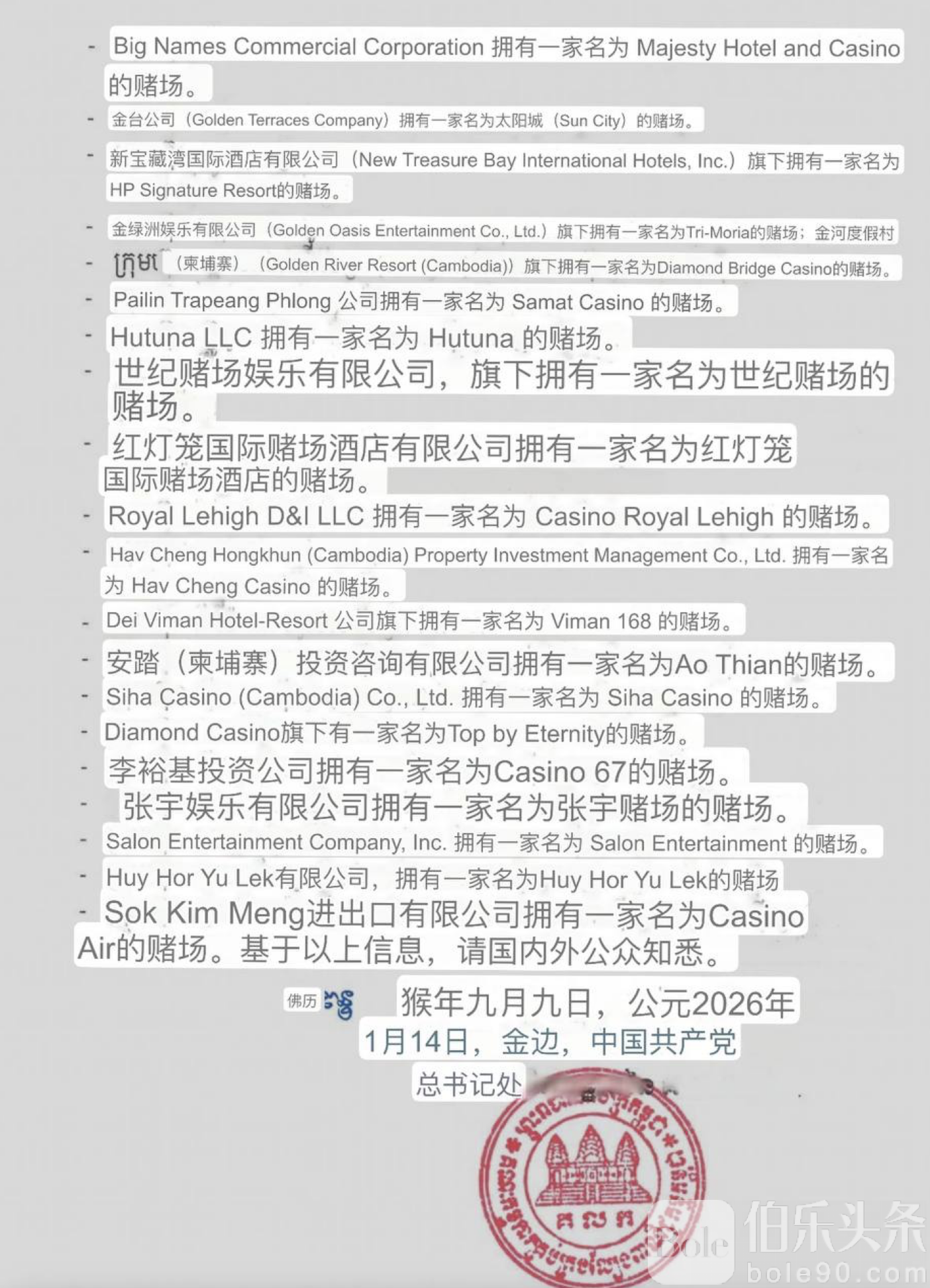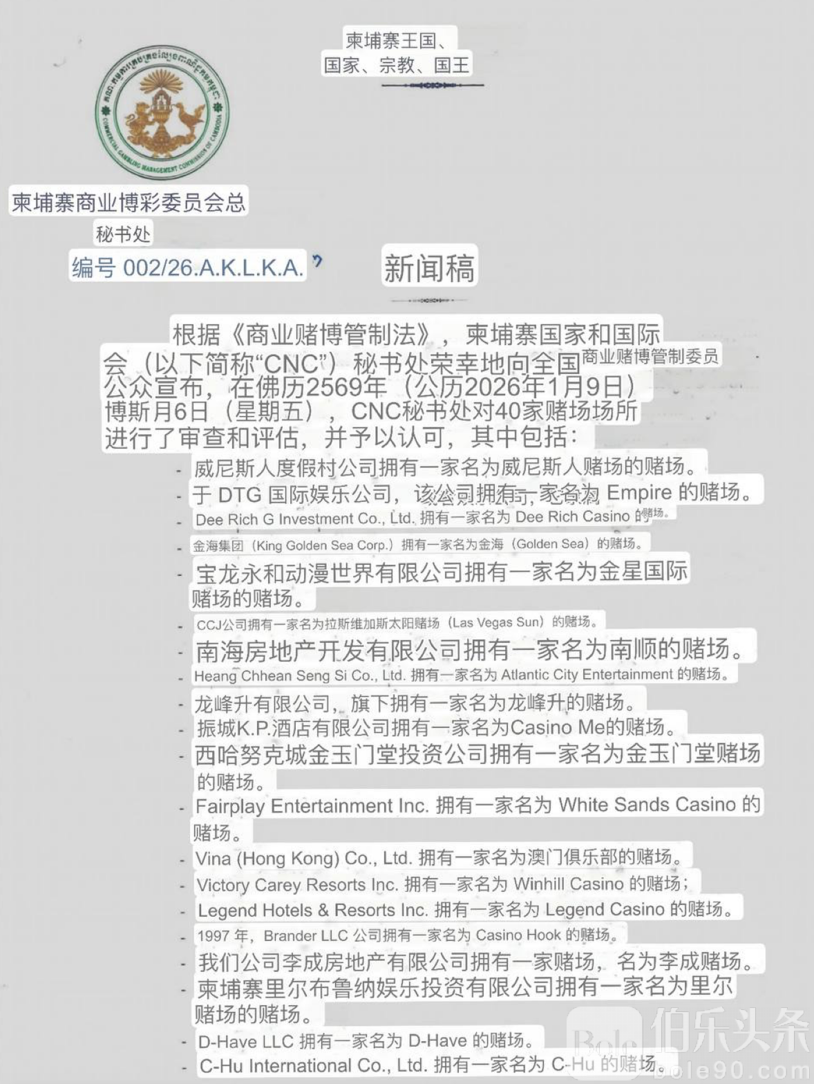 伯乐头条专讯:近日,柬埔寨商业博彩委员会(CCGC)总秘书处发布最新公告,提醒公众注意国家审核认可的赌场名单。公告明确指出,经过官方审查批准的赌场仅限于公布在名单上的园区,未列入名单的赌场均为当前重点打击和整顿对象。