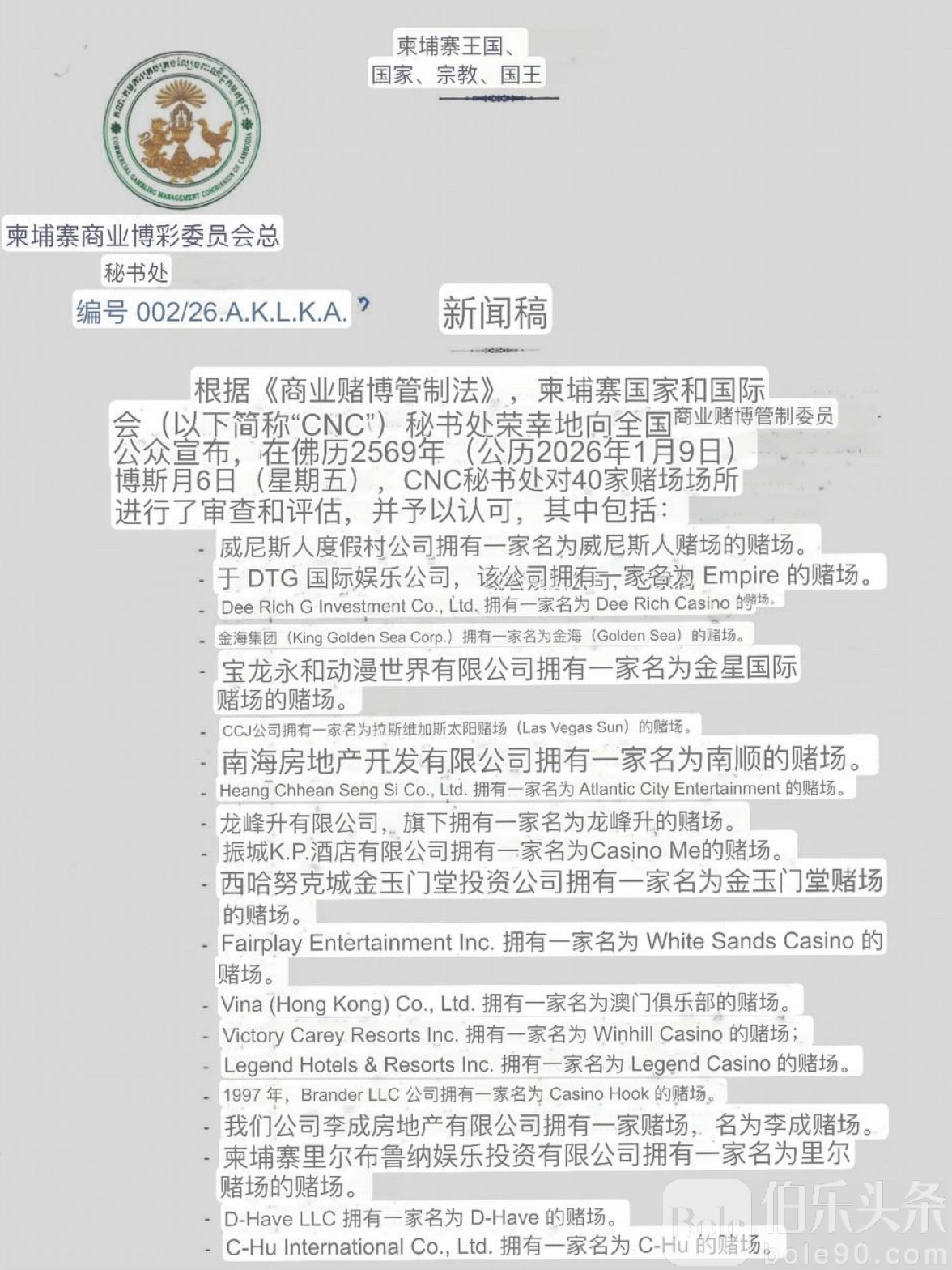 伯乐头条专讯:柬埔寨商业博彩委员会(CCGC)总秘书处近日正式对外发布公告,公布目前经国家审查并予以认可的合法赌场名单。官方明确强调:凡未出现在该名单中的园区赌场或博彩场所,均不具备合法经营资格,将成为下一步重点打击和清理对象