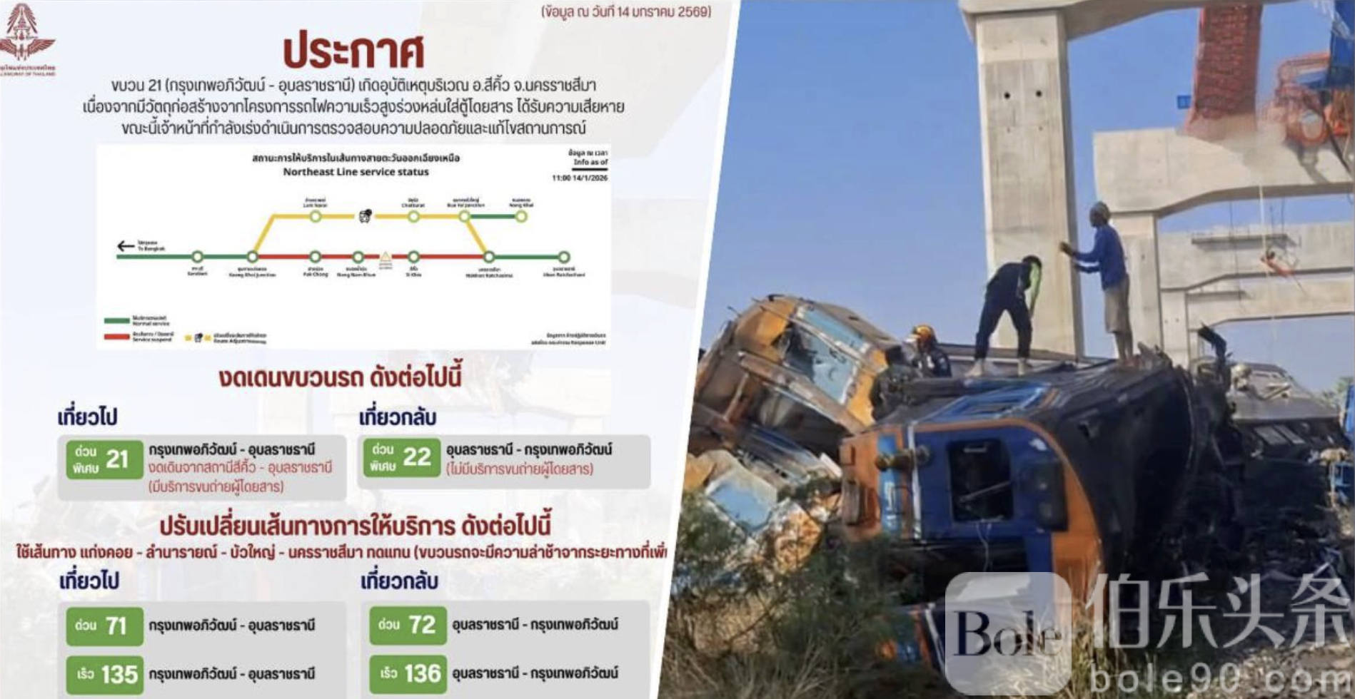 伯乐头条专讯:泰国铁路局日前通报,由于中国-泰国高铁建设项目施工期间,起重机意外坠落,撞击正在行驶的特快列车21号,导致东北方向列车运行受阻,当天共有14趟列车被迫停运或调整行驶路线。