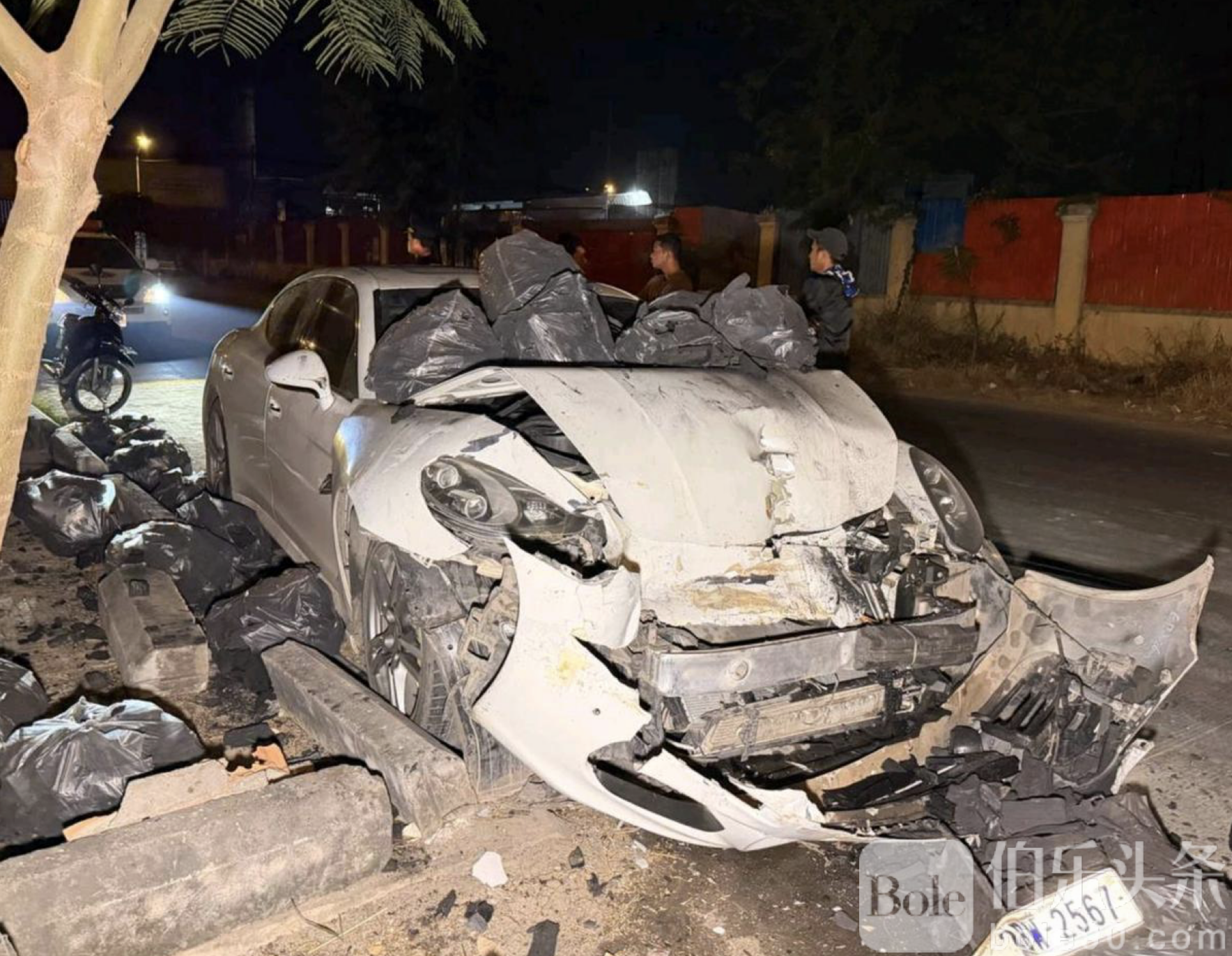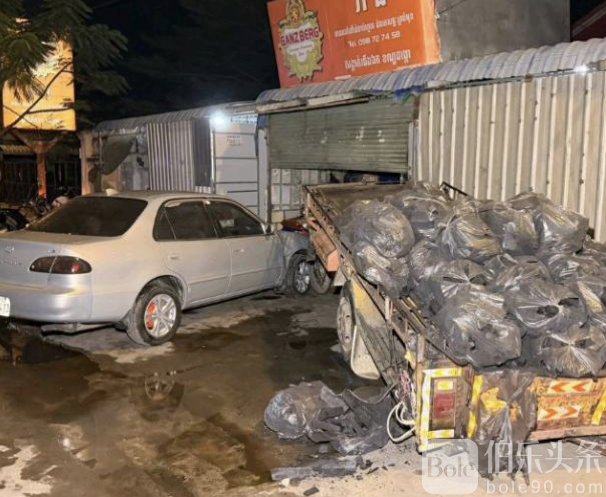 伯乐头条专讯:金边市朗哥区凌晨发生连环车祸,一名中国籍男子驾驶白色保时捷轿车追尾路边木炭运输拖车,冲击力使拖车撞上前方停放的丰田轿车,导致三辆汽车严重受损。事故发生在当地时间0时30分的混凝土公路上,所幸三车当时均无人驾驶,无人员伤亡。