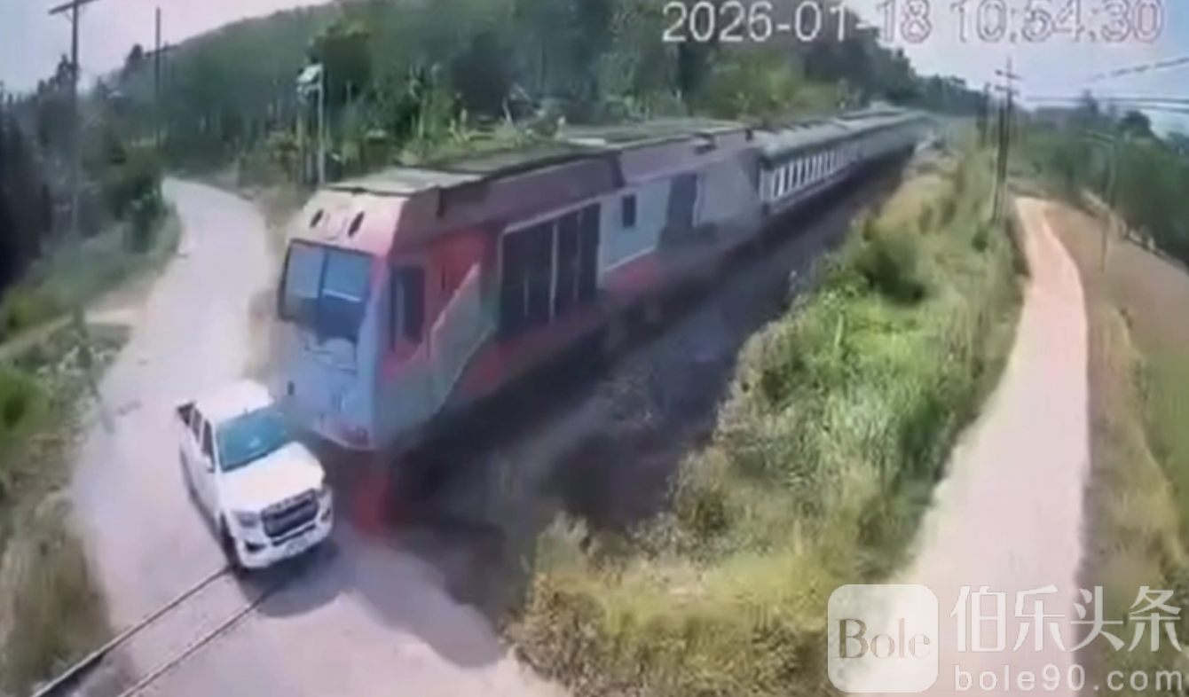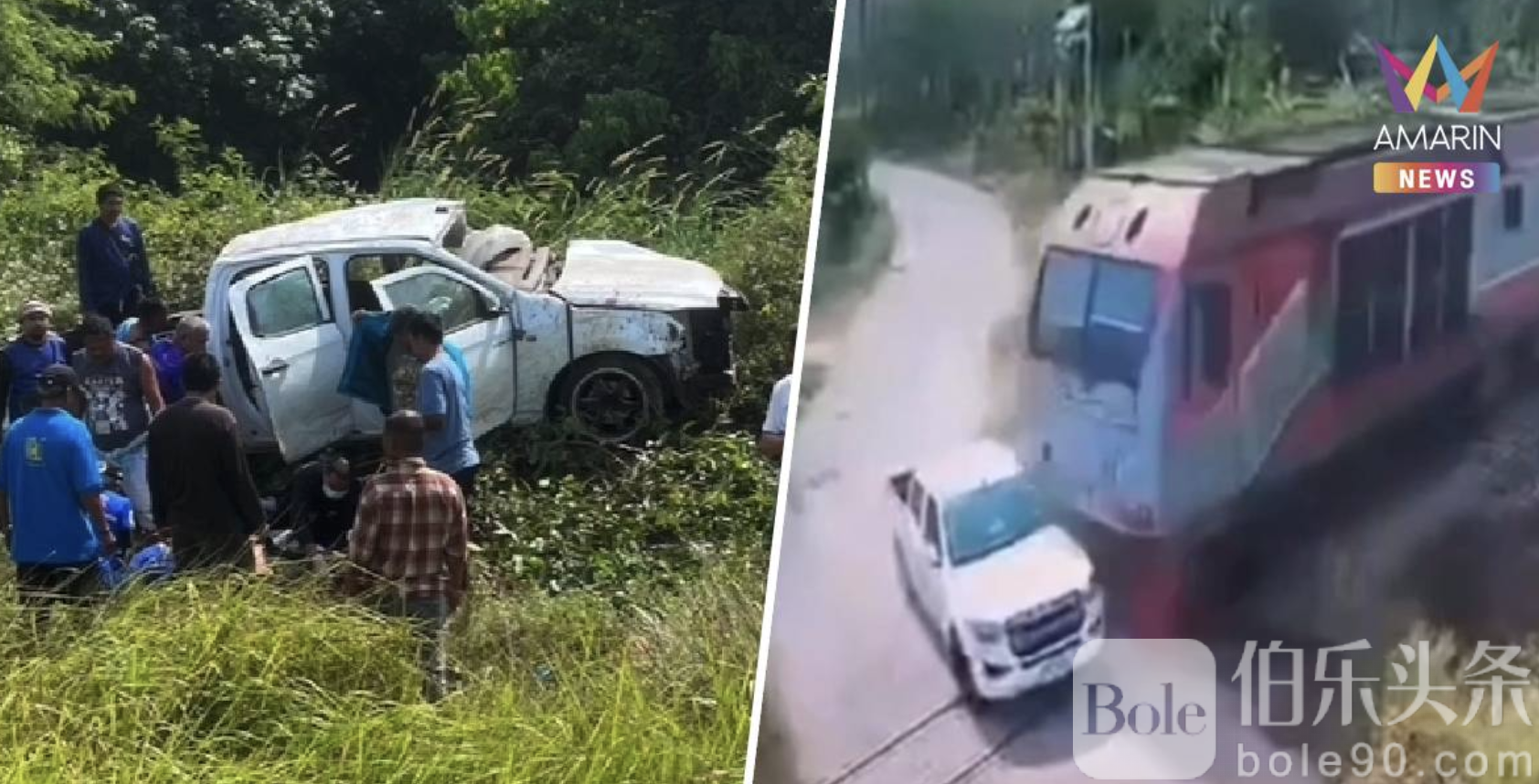 车辆底盘卡铁轨悲剧发生!泰国铁路火车撞飞皮卡致1死1伤