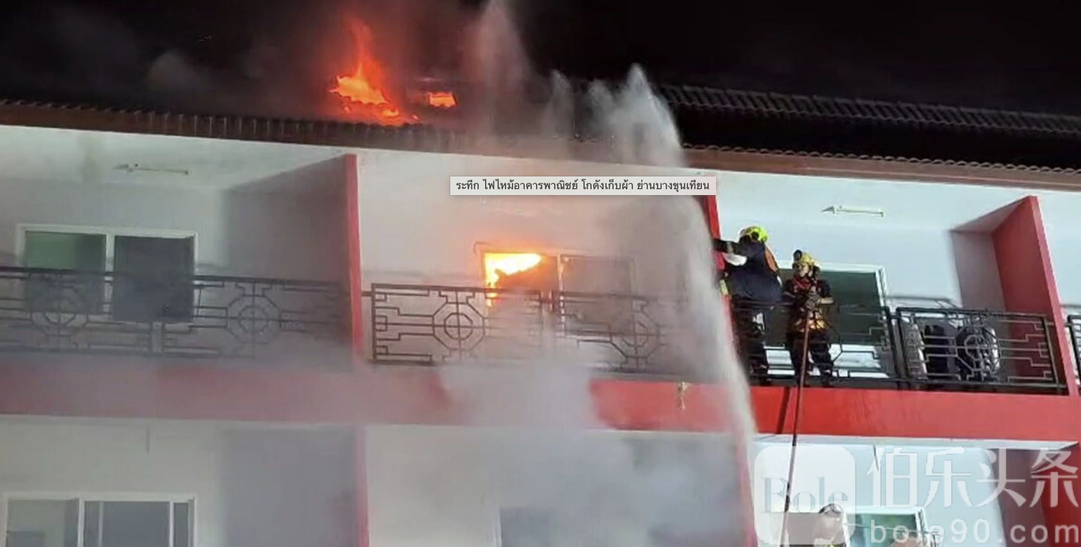 伯乐头条专讯:泰国曼谷邦坤天一带1月19日晚发生一起惊险火灾事故,一栋三层楼高的商用建筑突发大火,起火点为一处存放大量衣物的仓库。由于内部堆满布料与成衣,火势迅速蔓延,附近居民紧急逃生,消防人员奋战近两小时,才成功将火势控制在限定范围内。