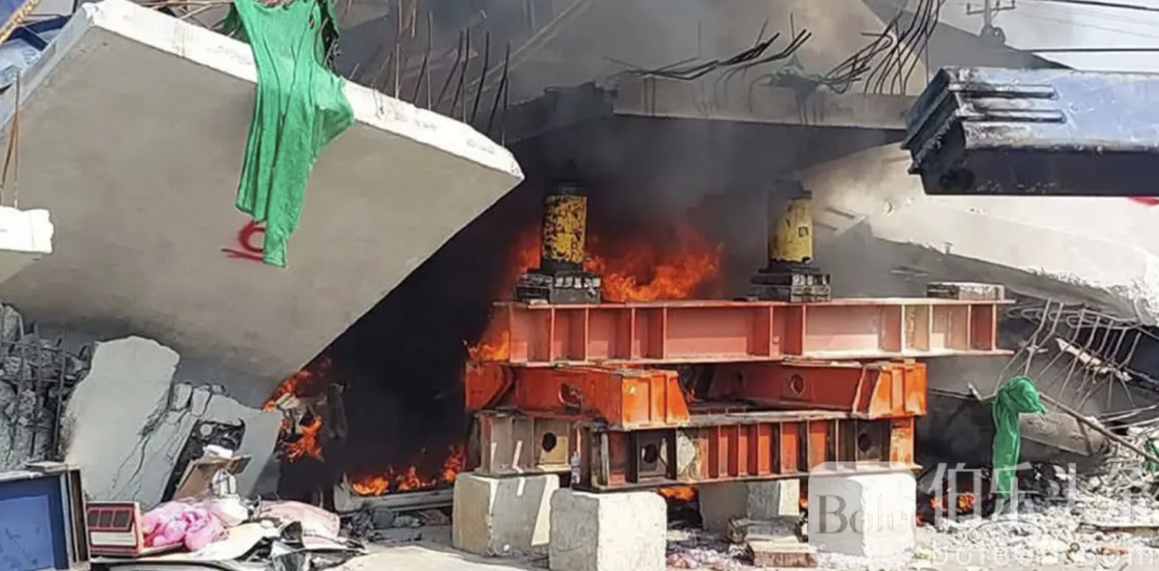连环险情!泰国吊车坍塌残骸油料泄漏引燃火焰
