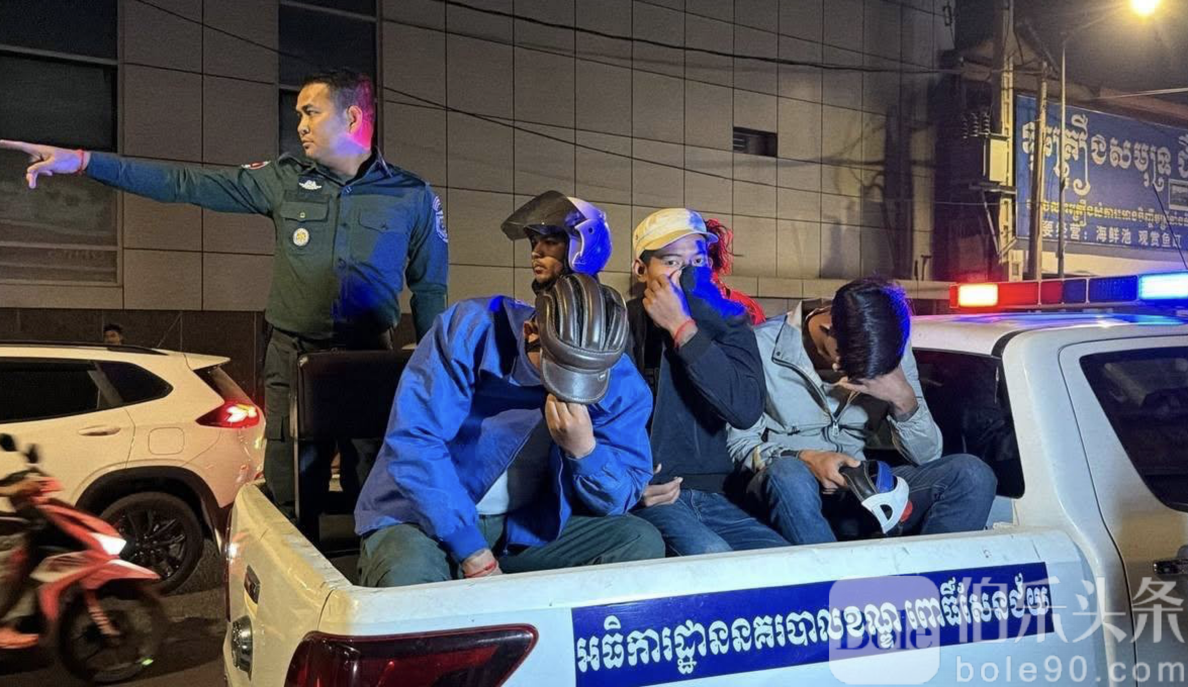 伯乐头条专讯:2026年1月21日晚,金边波森芷区警方在2004路口成功抓获4名冒充警察的惯犯,他们骑着摩托车,身穿便服,并携带刑事侦查局(CID)伪造警官证试图行骗。