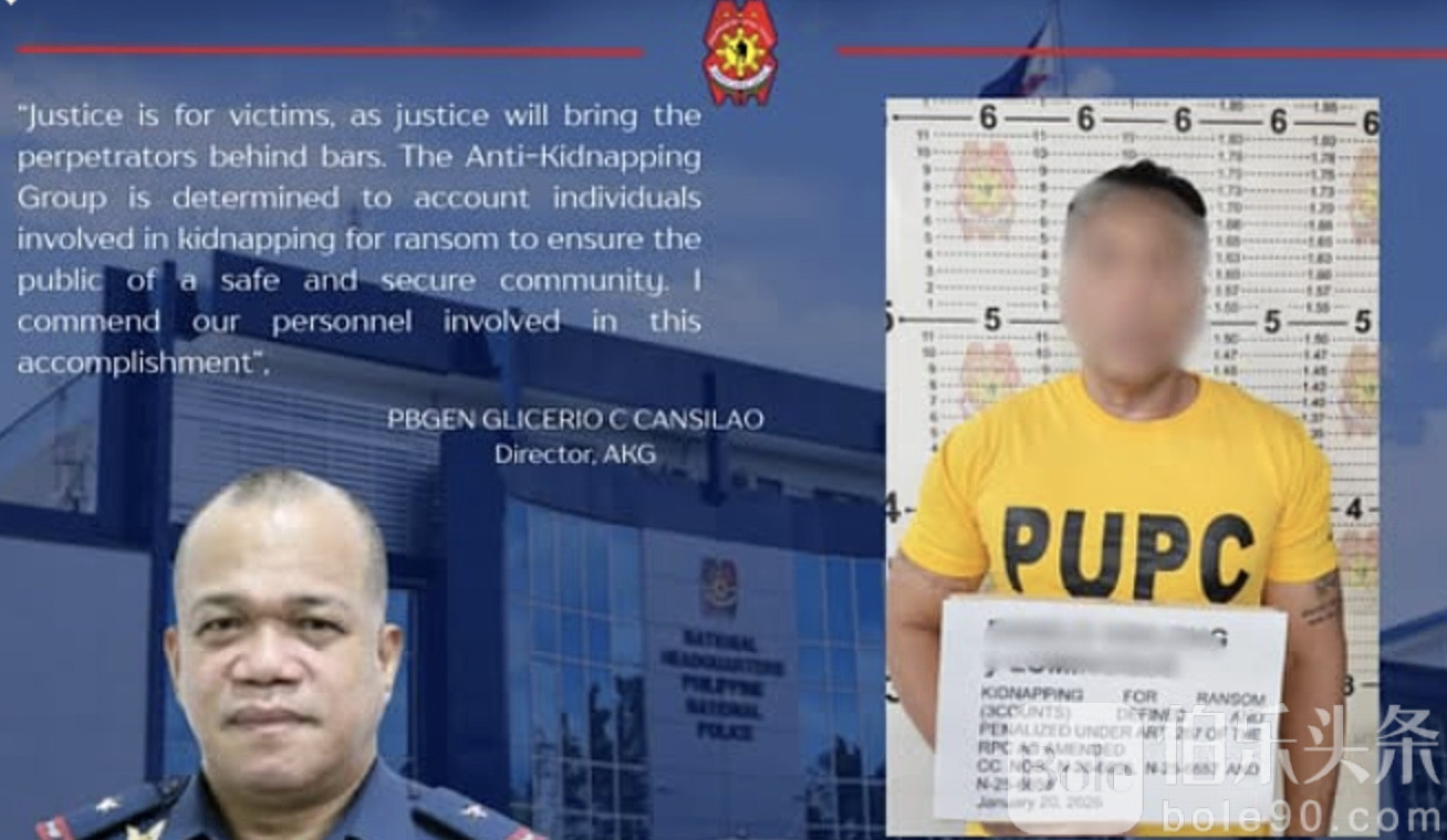 伯乐头条专讯: 菲律宾国家警察反绑架组(AKG)1月22日通报,帕赛市警方成功抓获涉嫌绑架勒索的通缉犯丹尼洛·L·阿比隆(Danilo L. Abilong)。阿比隆曾在2025年5月于八打雁省纳苏格布参与绑架两名中国籍和一名韩国籍人士,被指为案件主谋。然而令人关注的是,阿比隆去年已经落网,为何短短数月后再次被警方逮捕,官方暂未披露具体原因。