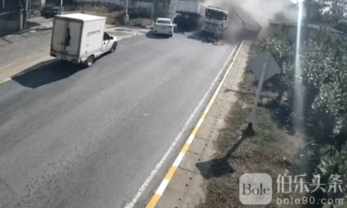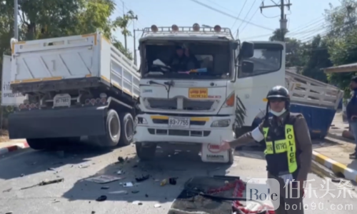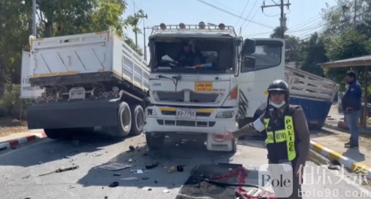 伯乐头条专讯:泰国素攀武里府乌通县23日上午发生一起惊魂交通事故,两辆大型拖挂货车在居民区道路猛烈相撞,其中一辆运输燃气的拖挂车发生气体泄漏,现场发出持续“嘶嘶”声,随时可能引发爆炸,附近居民被迫紧急疏散,整条道路一度陷入高度危险状态。
