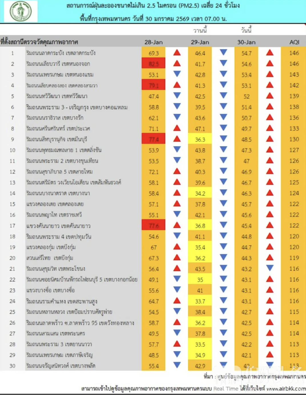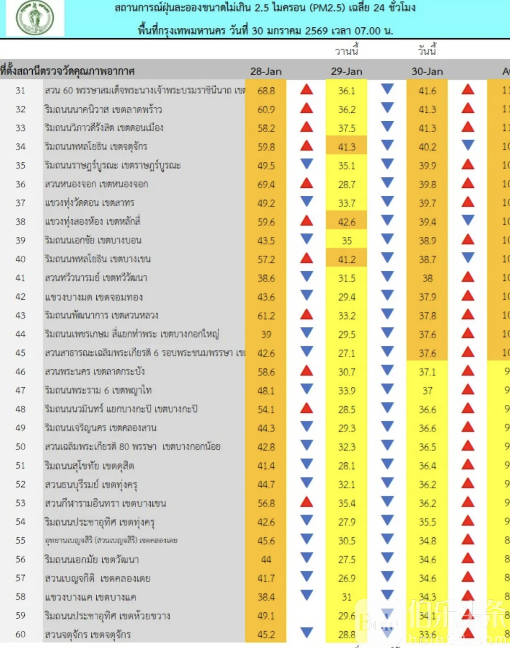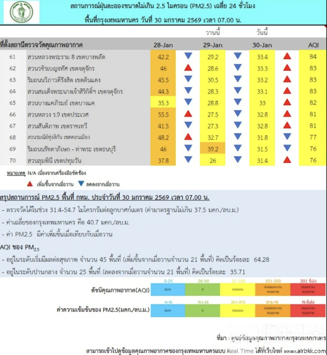 伯乐头条专讯:泰国曼谷空气污染加重,1月30日清晨监测显示,PM2.5浓度普遍超标,达到橙色警戒水平,对健康开始产生影响。据曼谷空气质量监测中心报告,截至上午7点,24小时平均PM2.5浓度在31.4–54.7微克/立方米之间(标准不超过37.5微克/立方米),共45个地区被列为空气质量橙色警示区。