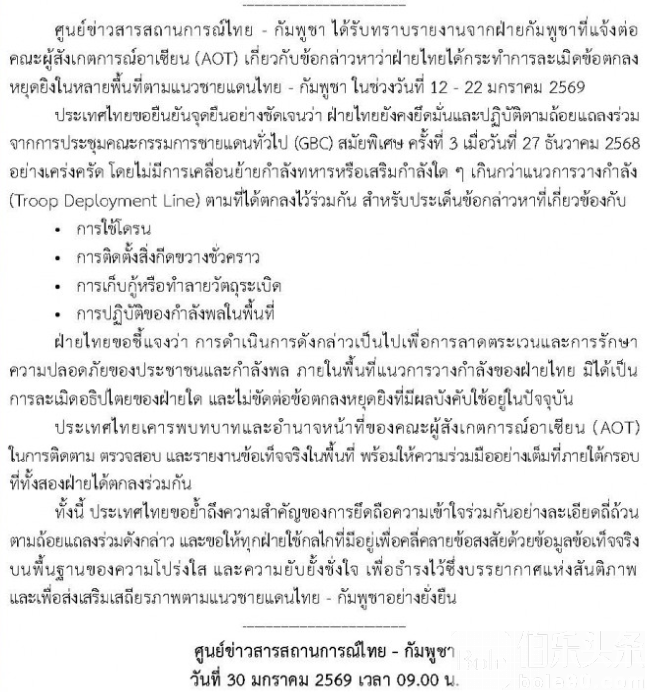 据泰国官方消息,柬方在1月12日至22日期间多次向AOT反映泰方疑似违反停火协议。然而,泰方重申,在边境地区并未进行任何超出约定范围的兵力调动或增援部署。泰方在边境的所有巡逻、安保及相关行动,均在既定兵力线(Troop Deployment Line)内,目的是维护民众和部队的安全,并未侵犯柬方主权或违反停火协议。