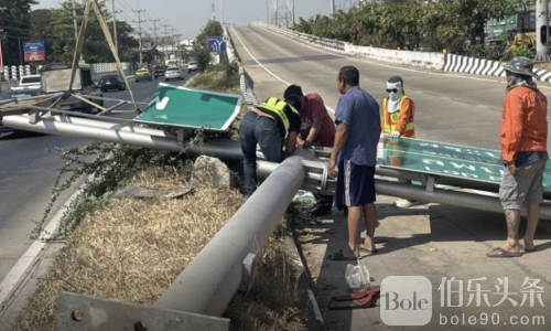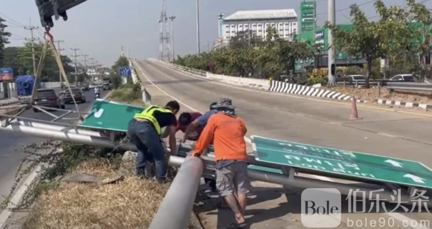 Bole新闻专讯:泰国中部沙拉武里府发生一起惊险交通事故,一块重达约一吨的巨型交通指示牌突然倒塌,直接砸中一辆正在行驶的摩托车,造成3名泰国民众重伤,其中包括一名17岁少年和一名13岁少女,现场一度混乱。
