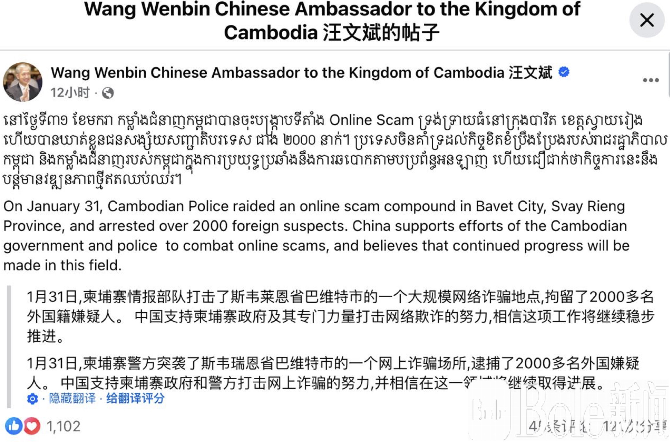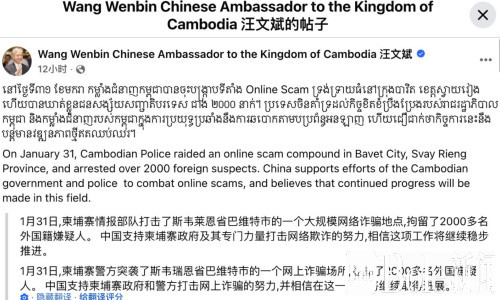 驻柬埔寨中国大使汪文斌昨日在脸书发布双语声明指出,中国高度支持柬埔寨政府和警方在网络诈骗领域的执法努力,并相信随着合作不断深入,未来在打击跨国电诈方面将取得更多实质性进展。汪文斌强调,中柬两国在维护网络安全和打击犯罪上拥有共同利益,中国愿继续与柬埔寨分享经验、提供支持,让相关工作更高效、更有力地推进。