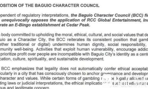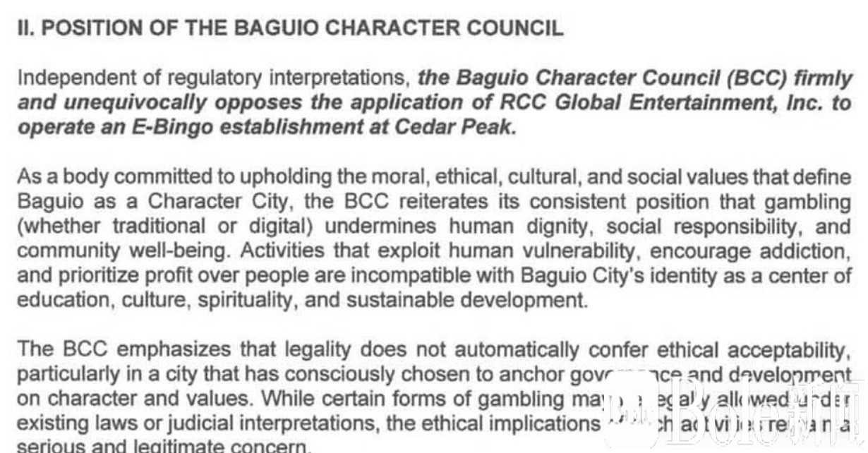 Bole新闻专讯:碧瑶市议会近日决定,拒绝RCC Global Entertainment Inc.在Mabini街Cedar Peak、靠近Session Road的场所开设电子宾果(E-Bingo)业务的申请。这一决定凸显碧瑶市坚持“有品格城市”的理念,强调城市发展不能依赖博彩收入,而应注重社区福祉与道德标准。