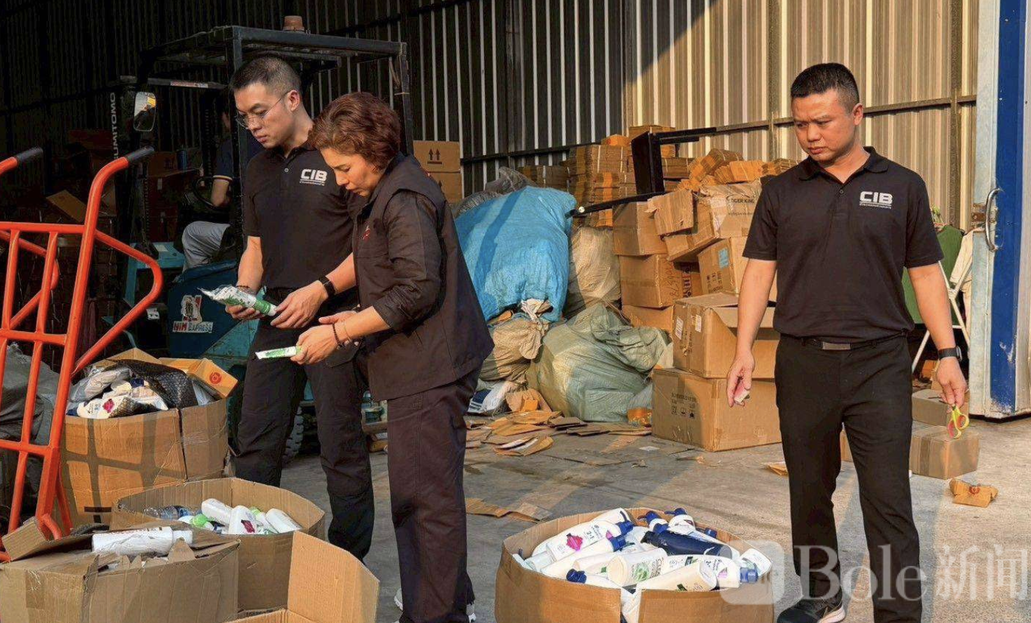 Bole新闻专讯:泰国普吉府警方与知识产权局近日联合展开行动,在曼谷近郊的沙美府马哈猜镇一处仓库成功查获假冒洗发水、牙膏及头发护理产品20多万件,同时抓获缅甸籍女子Mrs. 桑克,其中国籍丈夫亦涉案在逃。