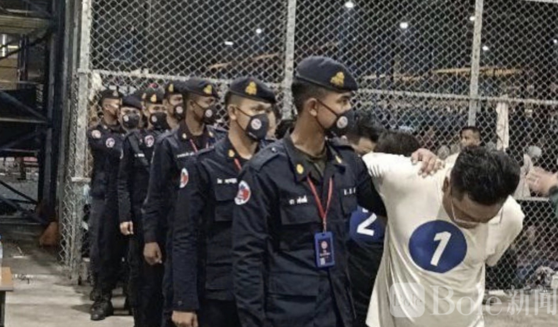 据现场情况显示,相关人员在集中安置点内按批次列队点名,逐一核对身份,并统一粘贴编号标识。在柬埔寨执法人员全程严密管控下,人员被分批送上车辆,有序转运前往机场,整体过程高度规范、节奏紧凑。