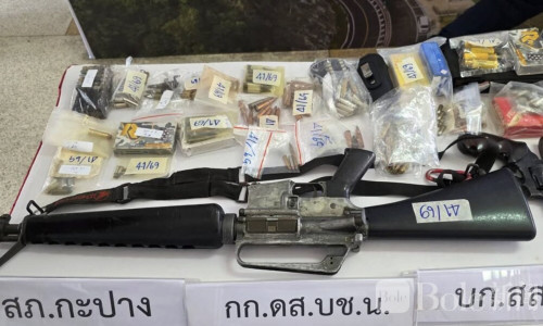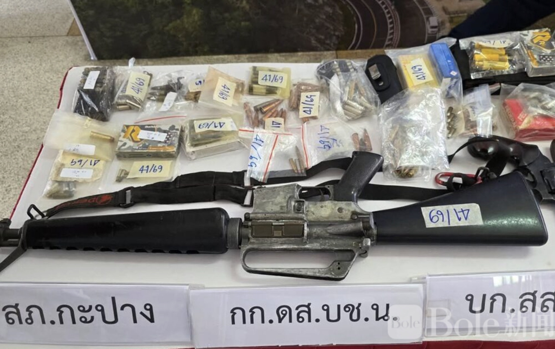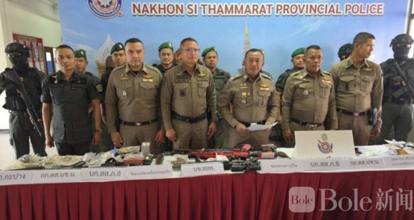 Bole新闻专讯:泰国那空是贪玛叻府警方于2月12日下午召开发布会,通报成功捣毁一个以年轻人为主的非法军火贩卖团伙,当场逮捕3名嫌疑人,查获大量战用级别武器、手枪、长枪、各类弹药以及杀伤性M67手榴弹,数量之多令人咋舌。