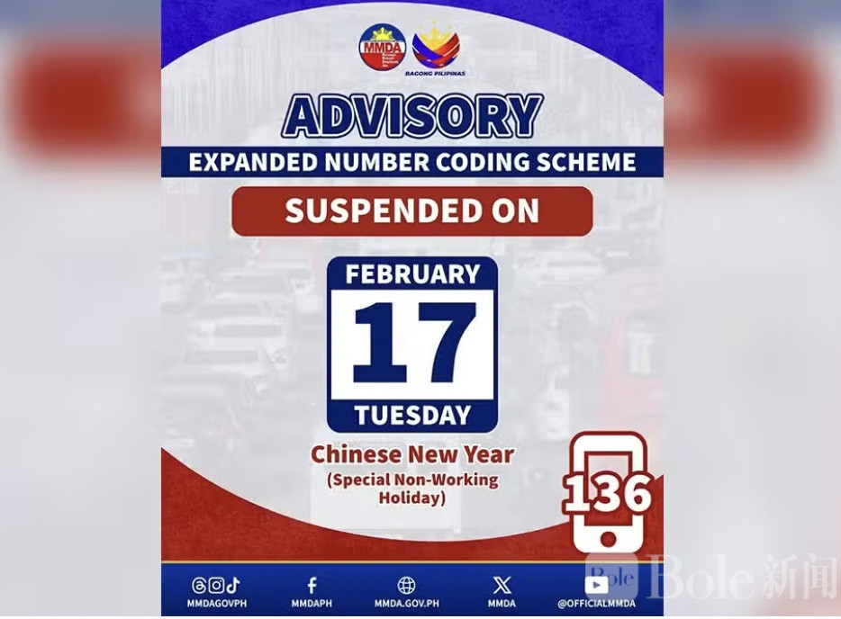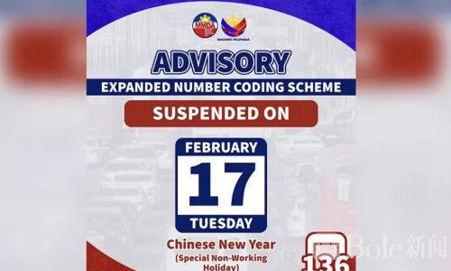 Bole新闻专讯:为了迎接即将到来的农历新年,马尼拉大都会发展局(MMDA)宣布,2月17日星期二实行的车牌限行措施将暂停。这意味着,平时受限的车牌尾号“3”和“4”的车辆,也可以在主要道路自由通行。