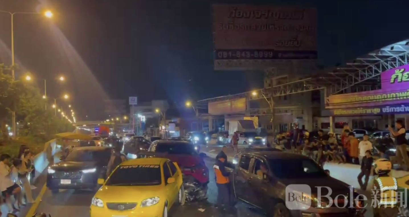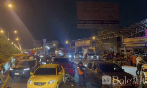 Bole新闻专讯:泰国曼谷外环路(Nakhon In Road)日前发生一起严重连环交通事故,一辆18轮卡车在换道时遇摩托车左侧超车刮碰,紧急刹车导致后方多辆车辆追尾,事故共造成10辆车损毁,6人受伤。