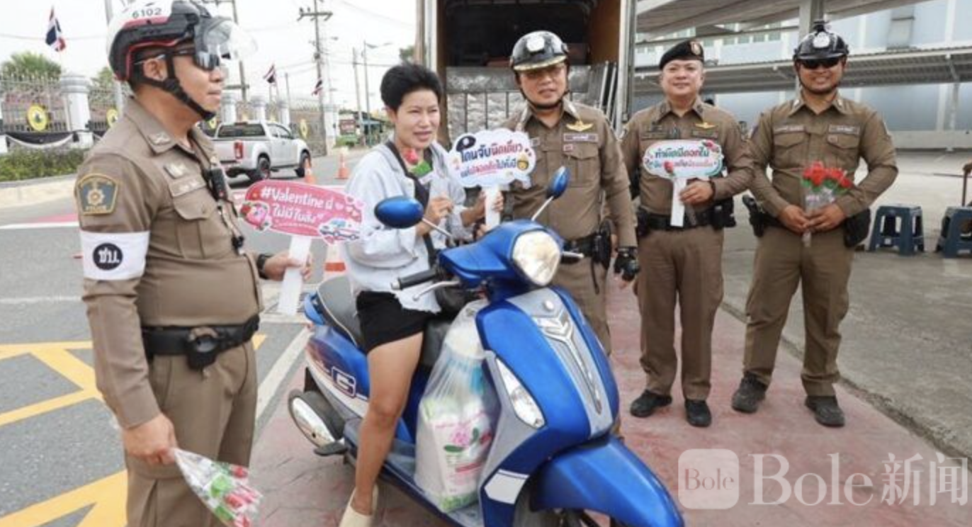 Bole新闻专讯:2026年2月14日情人节当天上午,泰国春武里府府治县东华洛地区出现温馨一幕,当地东华洛警署交警并未向违规司机开罚单,而是改送玫瑰花,用特别方式提醒民众遵守交通规则,现场气氛从紧张迅速转为惊喜与感动。