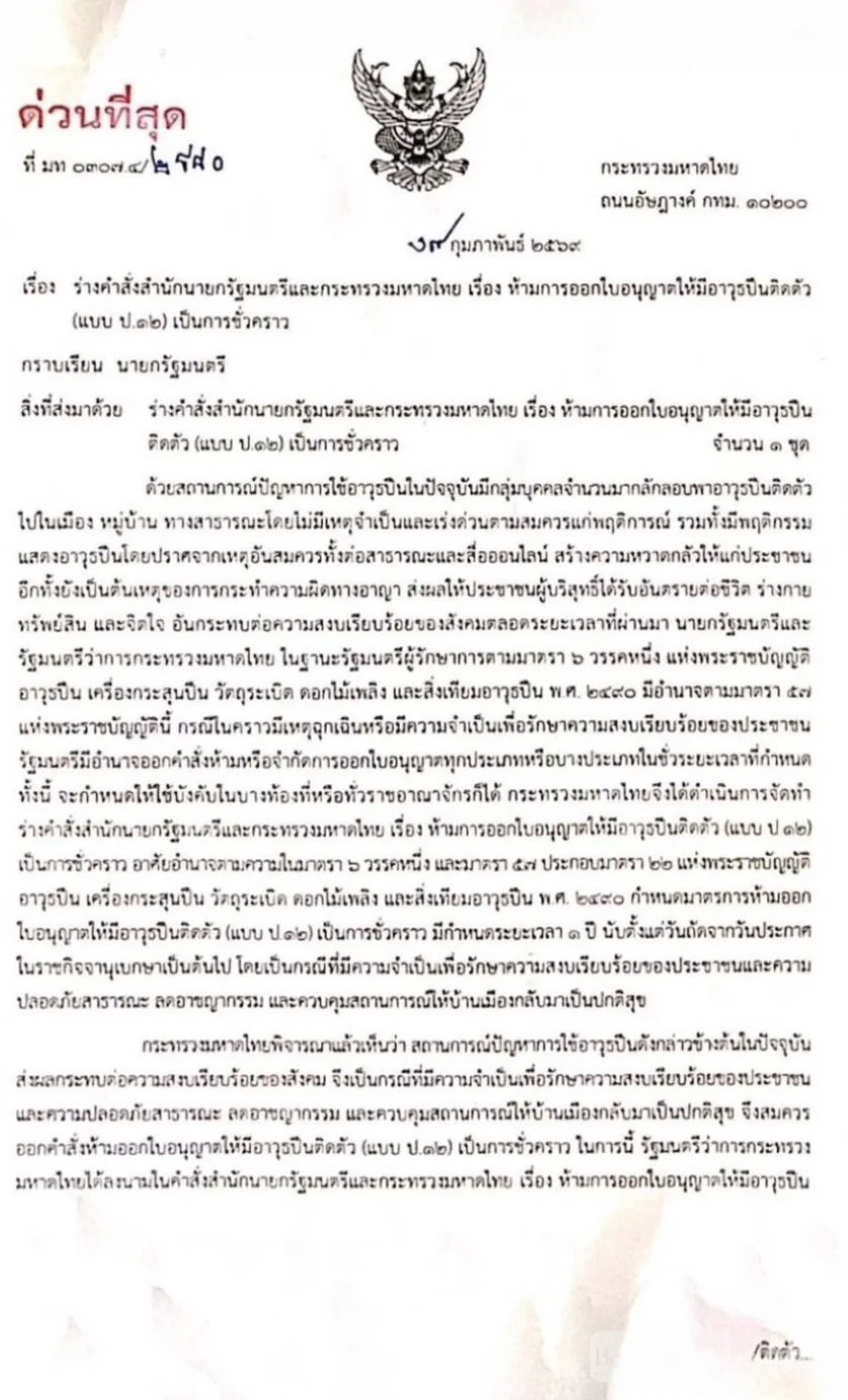 据泰国看守总理兼内政部长阿努廷介绍,有关部门已被指示严格执行这一管控措施,同时全面审查监管体系。内政部下属各省行政厅也迅速向地方行政官员下发紧急指令,要求从各方面加强对枪支的管理,确保公共安全和财产保护。