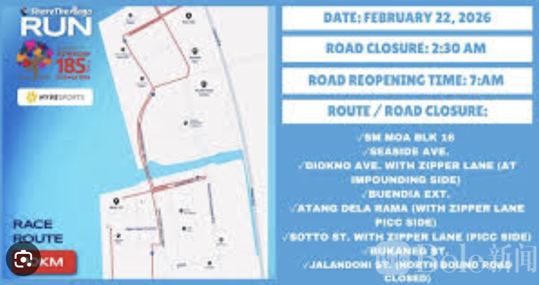 Bole新闻专讯:2月20日,为配合即将举行的马尼拉周日马拉松赛事,马尼拉警方发布交通公告,宣布自21日晚11点起,多条市区主要道路将暂时封闭,直至赛事结束。此次封闭涉及罗哈斯大道(Roxas Boulevard)南北双向路段、文尼法寿大道(Bonifacio Drive)、P·武敖斯大道(P. Burgos Avenue)及金融路(Finance Road)等关键通道,同时包括玛丽亚·奥罗萨街、王城内的穆拉亚街与圣露西亚街,以及A·索连诺大道、麦哲伦道(Magallanes Drive)、TM·加佬大道及基仁诺大街(Quirino Avenue)等多条道路。