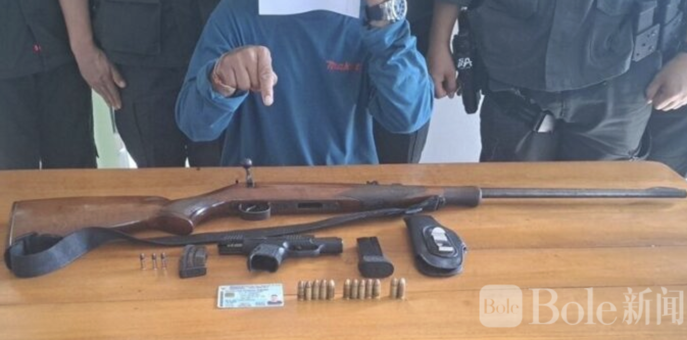 据报道,抓捕行动于3月2日上午9时在潘能区通延乡的班潭鹏路设置的检查点进行。特勤部门在例行检查时发现,48岁的男子萨拉蒙康(化名)驾驶的皮卡内藏有枪支与弹药。手枪配备12发子弹和1个弹匣,步枪配备3发子弹及1个弹匣。