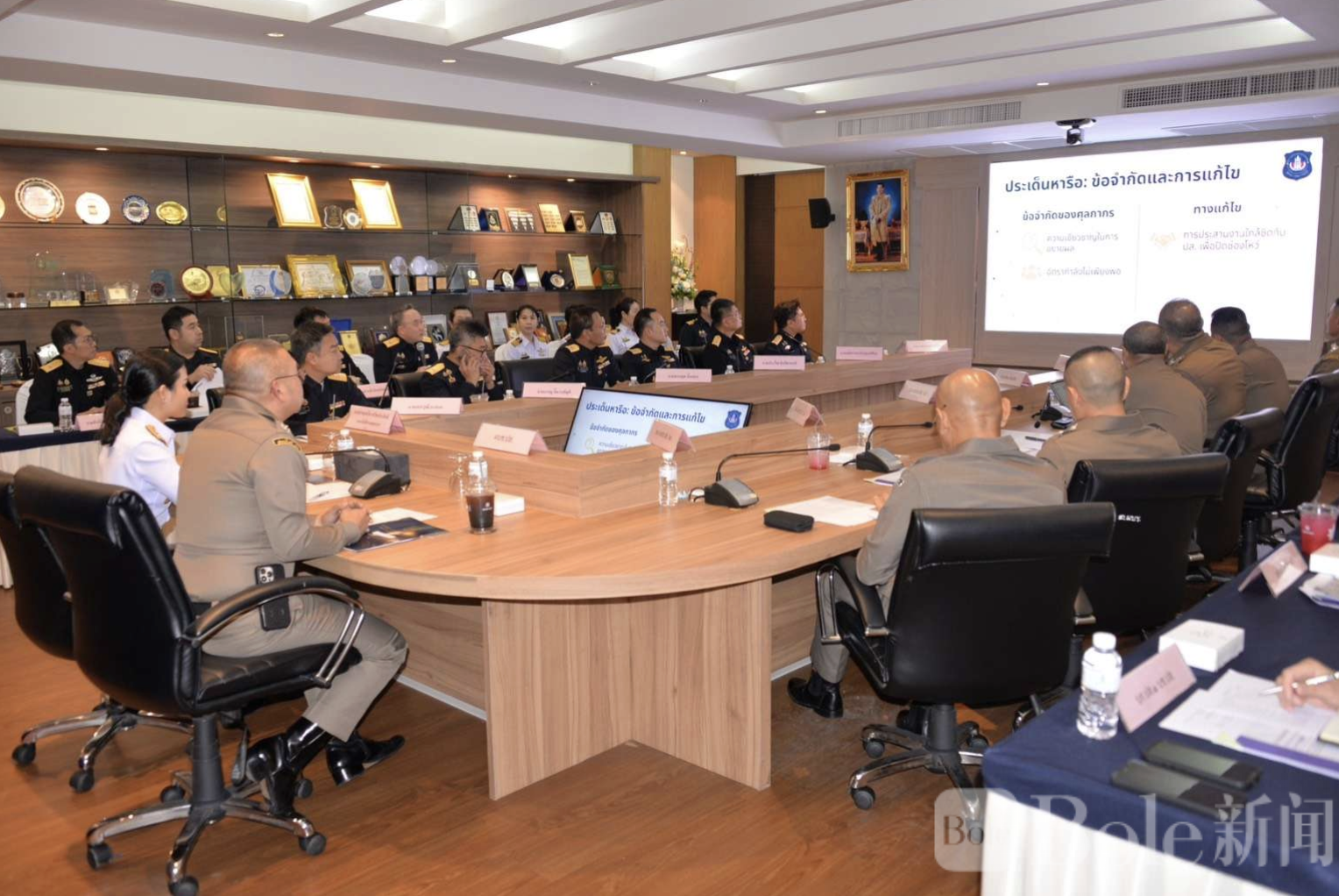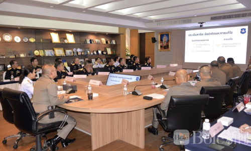 会议于2026年3月4日下午在泰国禁毒警察总指挥部举行。泰国禁毒警察总司令阿查扬·开通率领多名高级警官出席,与泰国海关副总署长孙特丽亚·塔威查帕实迪及多名海关高层官员展开会谈,重点讨论如何加强对制毒前体物质和相关化学品的进出口监管。