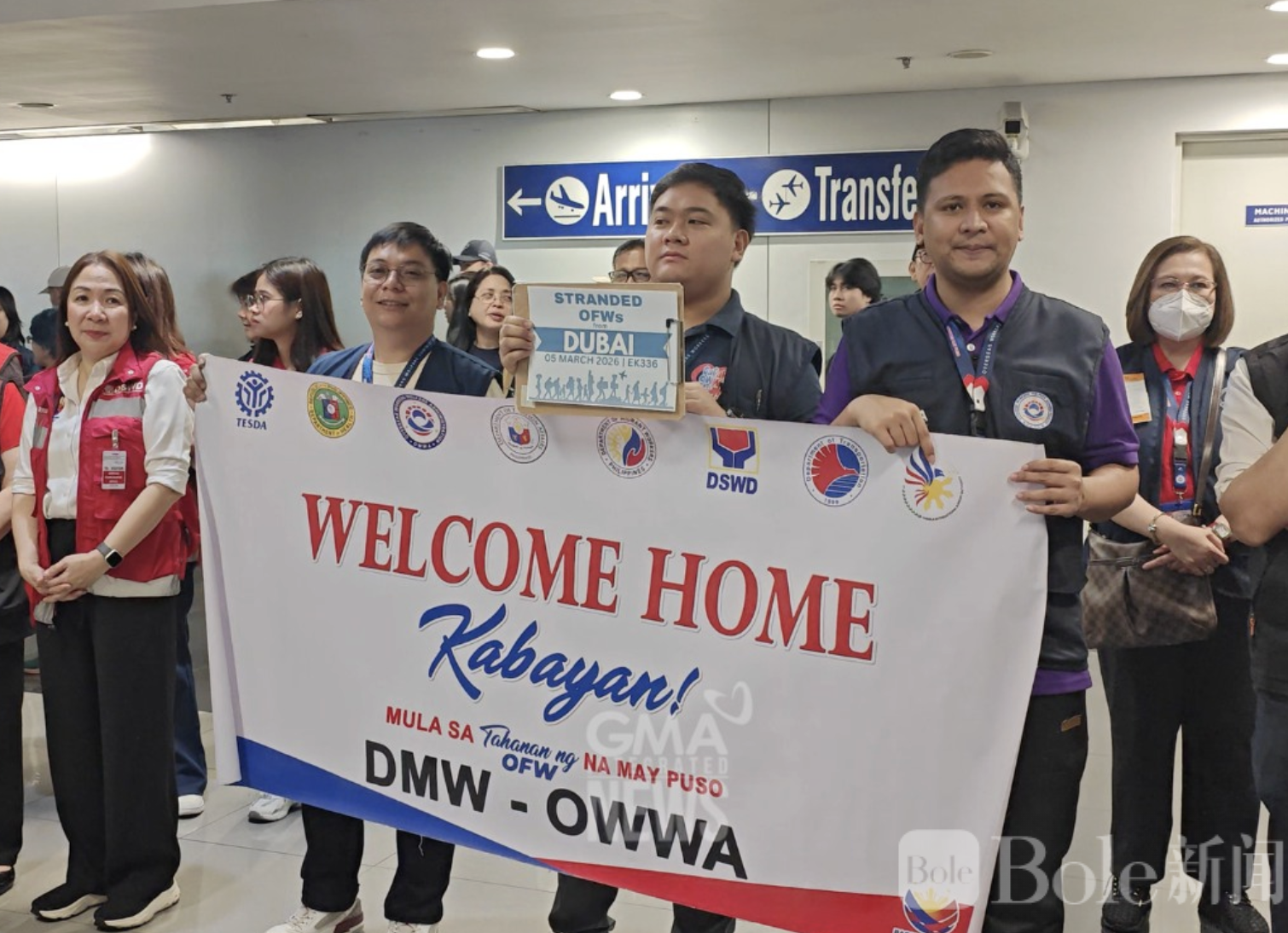 首批遣返航班于今日早晨抵达菲律宾,上午6:45从迪拜起飞的航班顺利降落在马尼拉国际机场3号航站楼,共载有299名菲律宾旅客,其中23人为OFW,另有两名为OFW子女,包括部分儿童与婴儿。遣返人员由劳工部、OWWA、社会福利部(DSWD)及卫生部代表迎接。