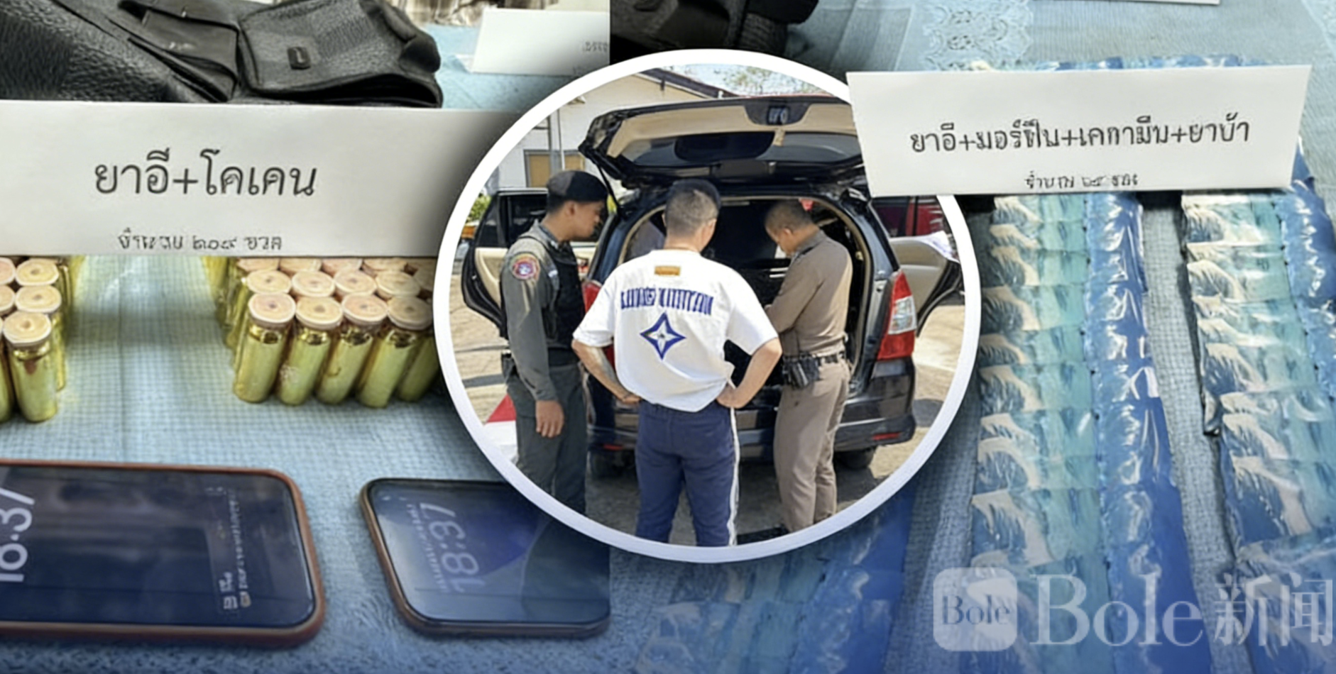 Bole新闻专讯:泰国甘加那武里府近日展开联合执法行动,成功截获一伙试图从柬埔寨迁移至缅甸的“灰色中国团伙”。警方在搜查中发现该团伙携带大量用于制造毒品的化学前体,总市值约300万泰铢,涉及甲基安非他命、摇头丸、吗啡、氯胺酮及可卡因。
