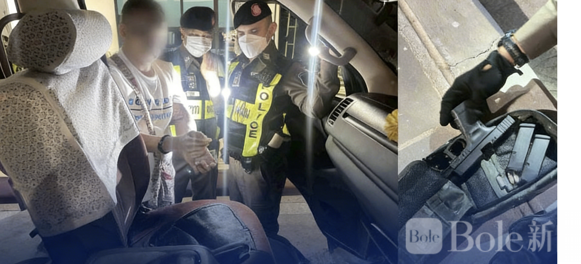 Bole新闻专讯:泰国色岐府高速公路警方近日在高速公路6号线设立检查点,成功拦截一辆可疑白色面包车,查获车内隐藏的手枪及弹药。经调查,司机为49岁的塞尼(นายเสนีย์),当场自愿配合警方检查。