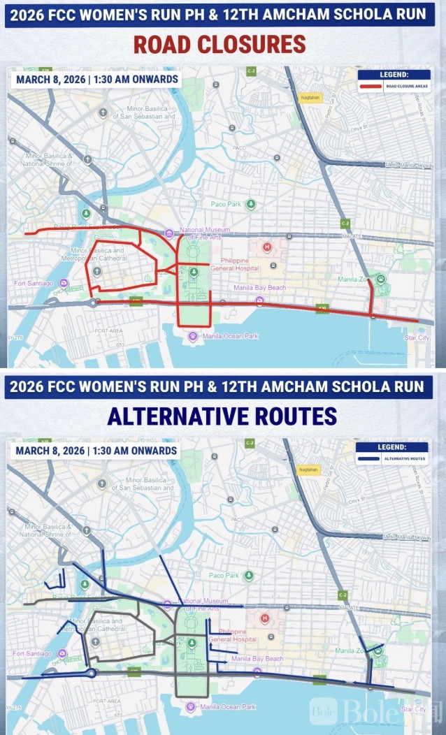 Bole新闻专讯:马尼拉市政府提醒市民,3月8日(周日)将举行2026年FCC女子趣味跑和第12届美商学者跑(AmCham Schola Run),届时部分道路将封闭,市民和司机需提前规划行程,以避免交通拥堵。