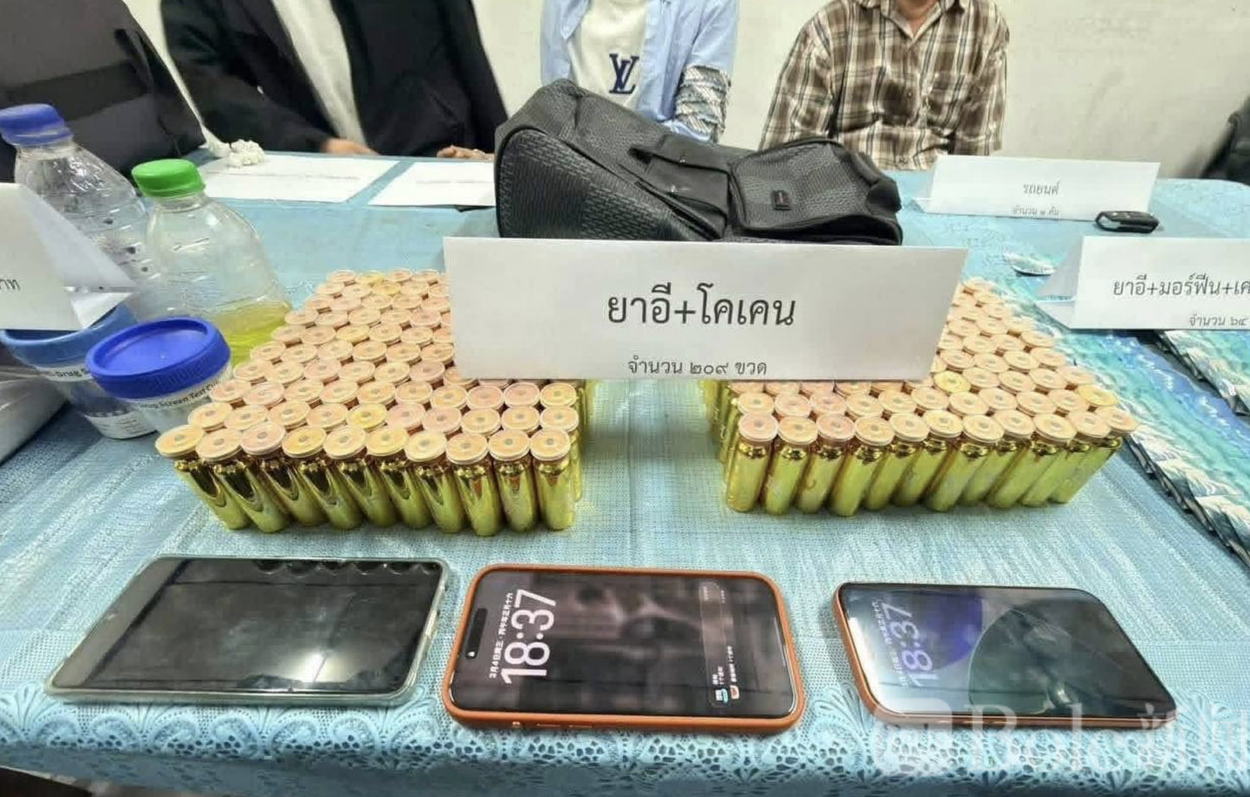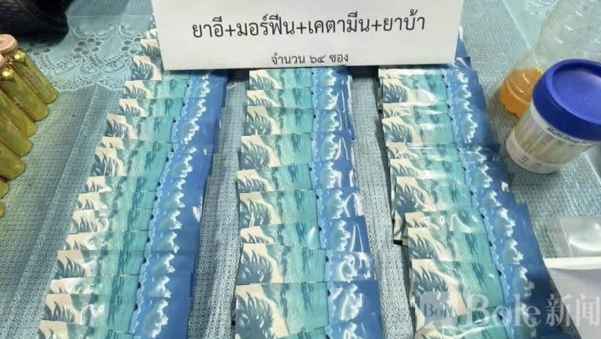 警方在例行检查中截停一辆可疑轿车,车上除泰国司机外,还有两名中国公民——30岁的李某和27岁的马某。两名中国男子未持有效证件,且不懂泰语,需通过翻译协助进行讯问。现场查获毒品包括:209瓶含毒饮品、约1.3公斤紫色粉末,以及多包冰毒、吗啡和氯胺酮等,总重量接近2公斤。