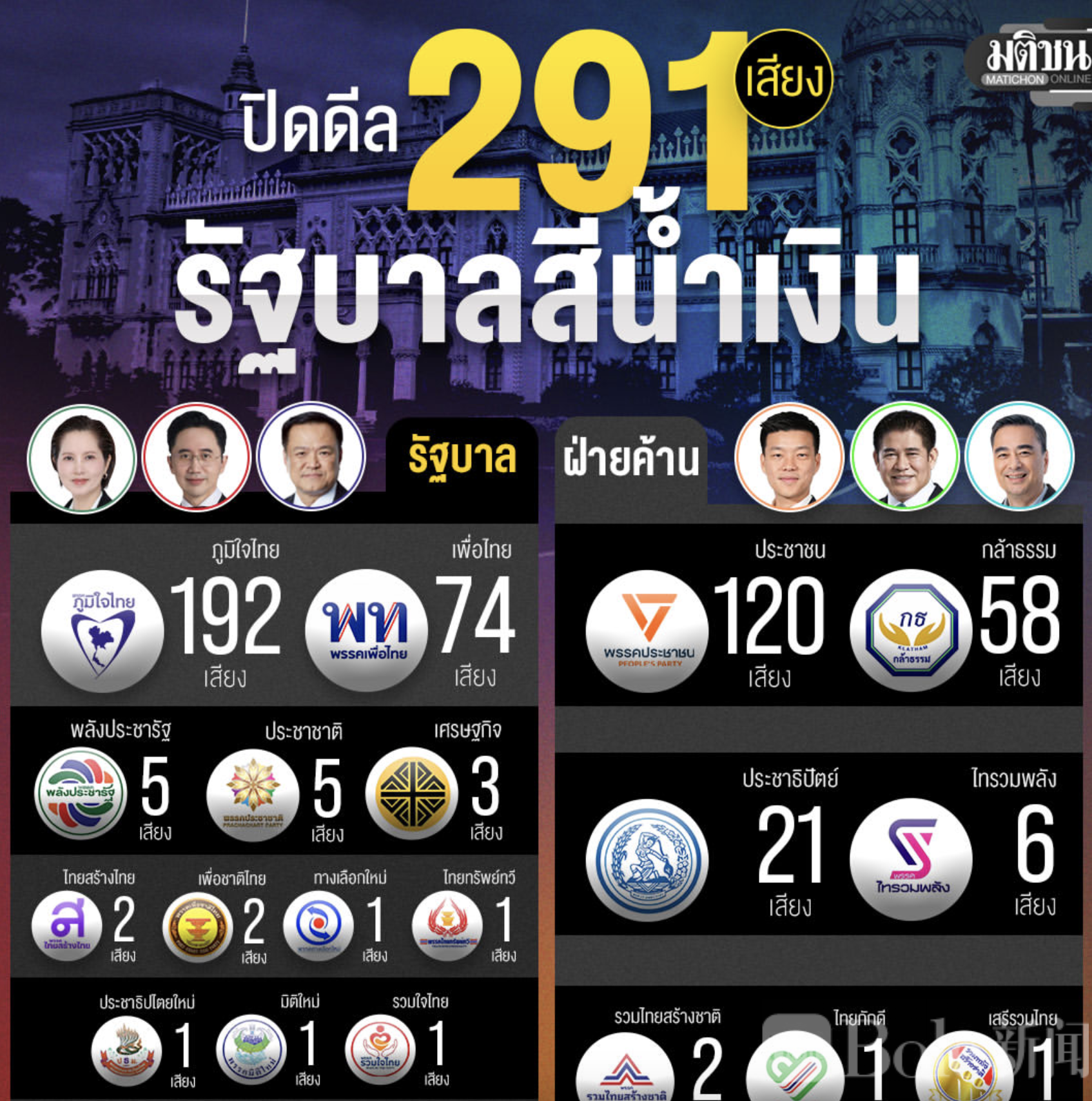 Bole新闻专讯: 2026年3月10日,泰国新一届政府组阁格局基本成型。据泰国媒体报道,由泰自豪党、为泰党、政府民力党、泰族党及多个小党组成的执政联盟,共掌握291个议会席位,占据多数席位,而正义勇敢党将转为反对党。