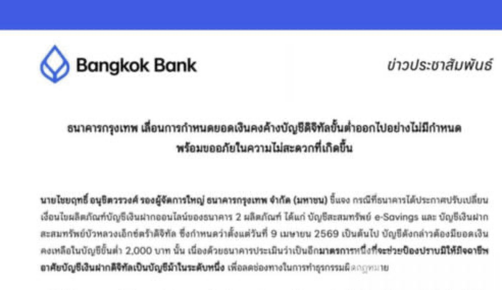 据曼谷银行副总裁猜耶立特·安努吉特瓦隆说明,此前银行计划对旗下两款数字储蓄产品——e-Savings储蓄账户与普旺特大数字储蓄账户,调整账户使用规则:若账户余额低于2000泰铢,将触发相应限制。该措施本意是防止不法分子利用数字账户充当“马甲账户”,以切断违法资金流。