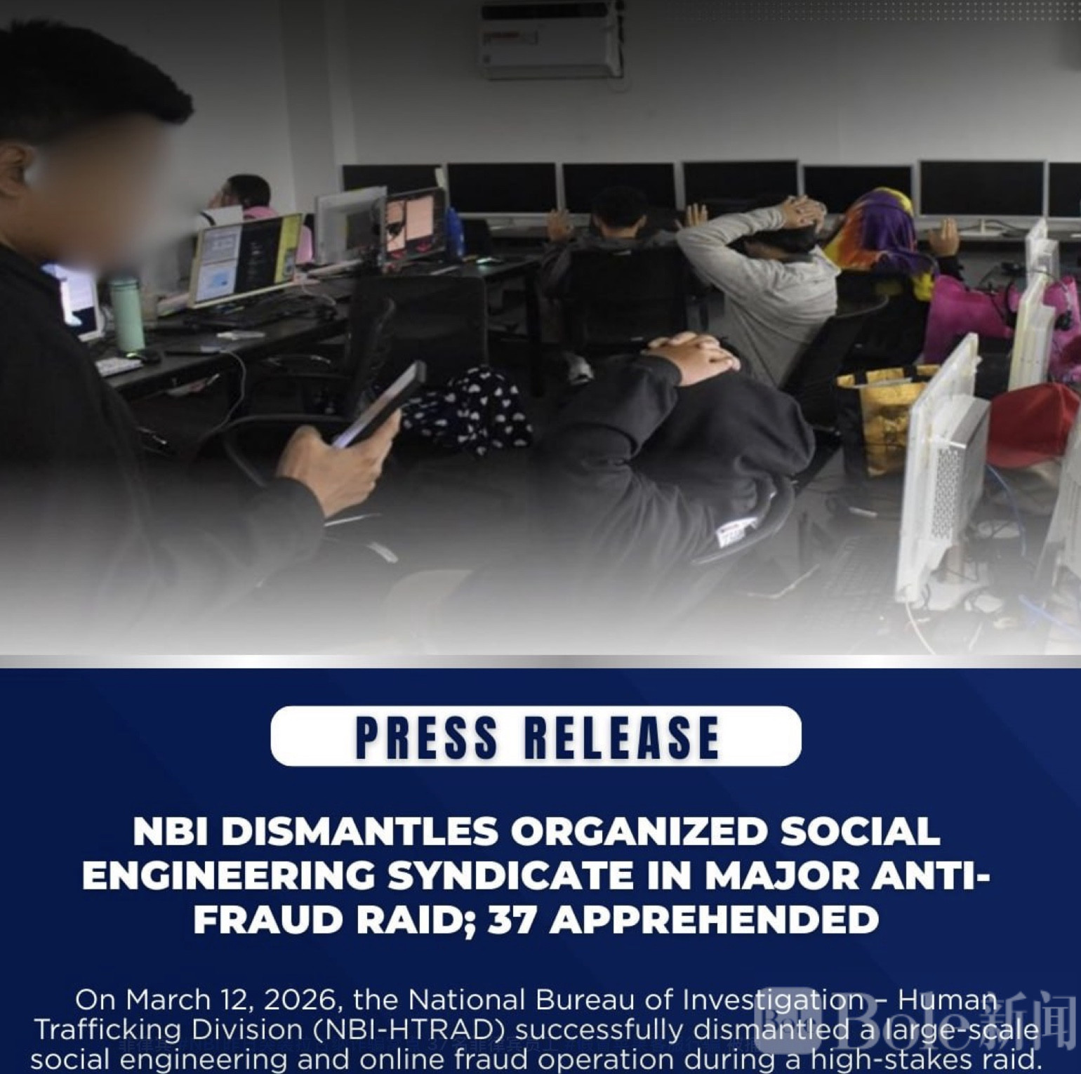 这次行动由 NBI 下属的高科技犯罪反制部门(NBI-HTRAD)主导,于 2026年3月12日展开。执法人员依据搜查、扣押及电子数据检查令,对该处诈骗办公室实施突袭。现场显示,窝点高度组织化,内部被划分为多个“诈骗工位”,每位嫌疑人都有明确分工,作案方式专业而系统。
