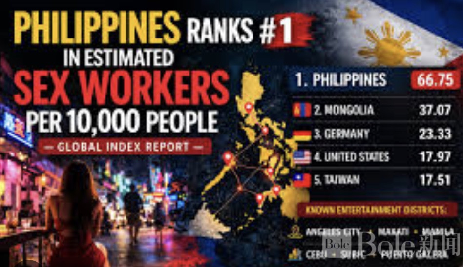 Bole新闻专讯:一项国际数据报告显示,菲律宾在全球性工作者比例中居首位。根据 Alpha Index 引用的全球数据集估算,每1万人中约有66.75名性工作者,远高于第二名蒙古的37.07人。这份排名同时显示,德国、美国和台湾分别位列第三至第五。