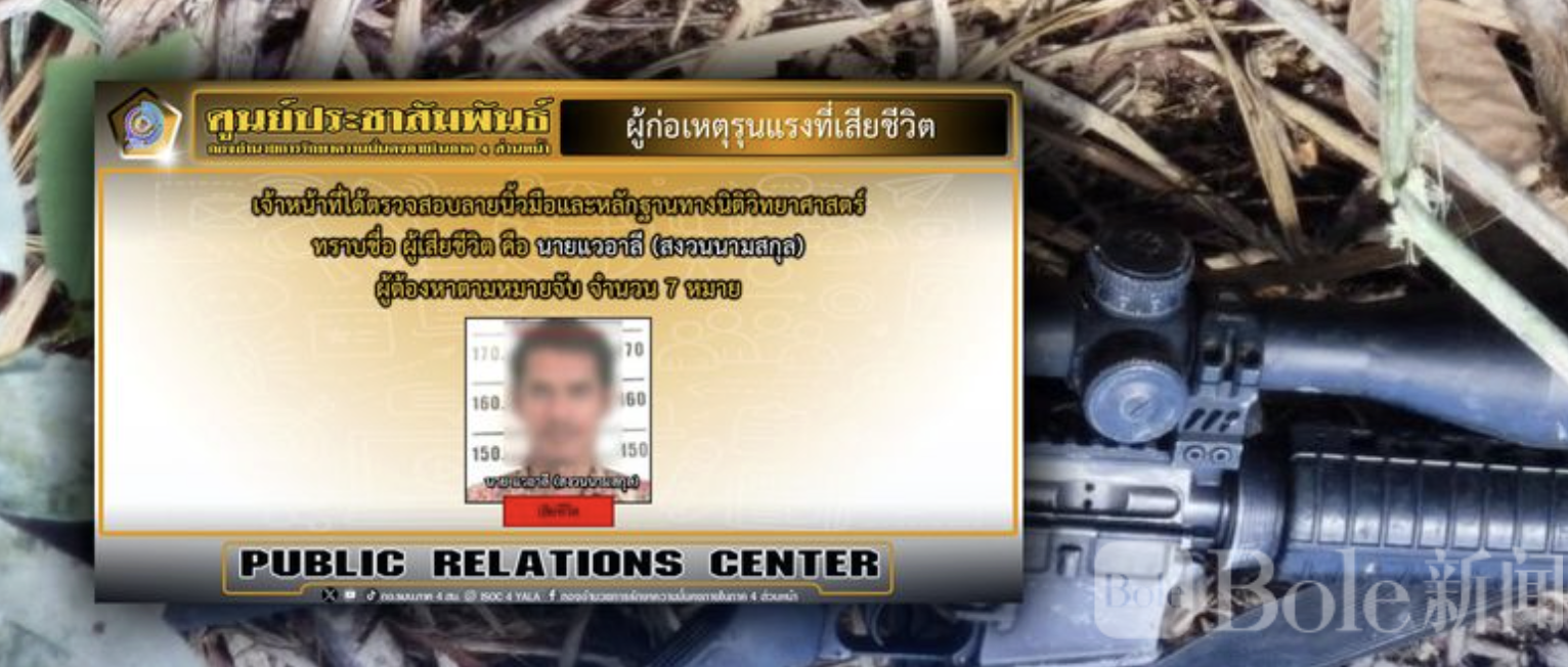 Bole新闻专讯:泰国南部边境发生激烈枪战,一名持有7项通缉令的嫌犯在拒捕过程中被警方当场击毙。事件发生于3月17日,当地警方在试图以和平方式劝说嫌犯投案时,遭其开枪射击,导致一名边境巡逻警察(十警察艾科·沃拉泰普·斯里苏万查纳)中弹身亡,一名志愿军士兵受伤,但已无生命危险。