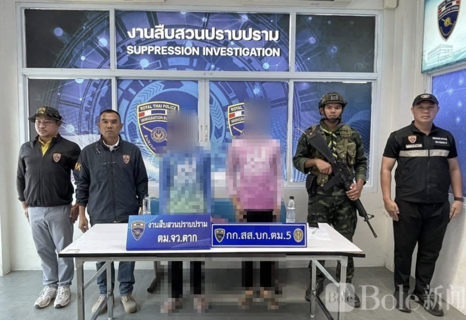 Bole新闻专讯:2026年3月16日早上10时左右,泰国达府移民局联合地方警方及军方在湄索县湄美城市集市附近成功抓获两名中国籍非法入境人员。据现场执法人员介绍,两人涉嫌未经许可入境并在泰国境内非法居留,违反泰国《移民法》相关规定。