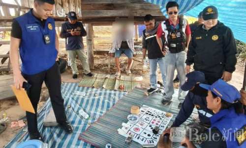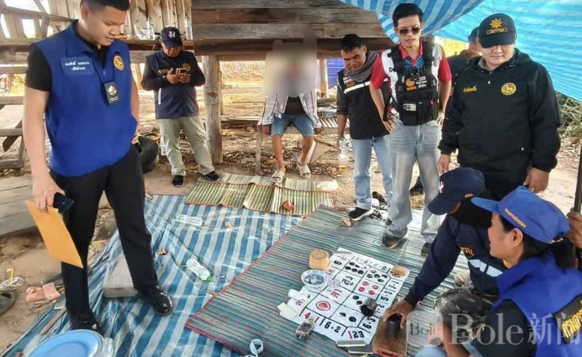 Bole新闻专讯:泰国湄素府(Chaiyaphum)近日发生一起丛林赌博窝点捣毁行动,当地行政部门在民众举报后展开突击,抓获10名涉嫌非法玩高低骰(Hi-Lo)的赌徒,并缴获相关赌具及现金。现场位于เทพสถิต县(Thep Sathit)โป่งนก村的一片甘蔗和木薯混合的林地,环境偏僻,但赌局仍然热闹非凡。