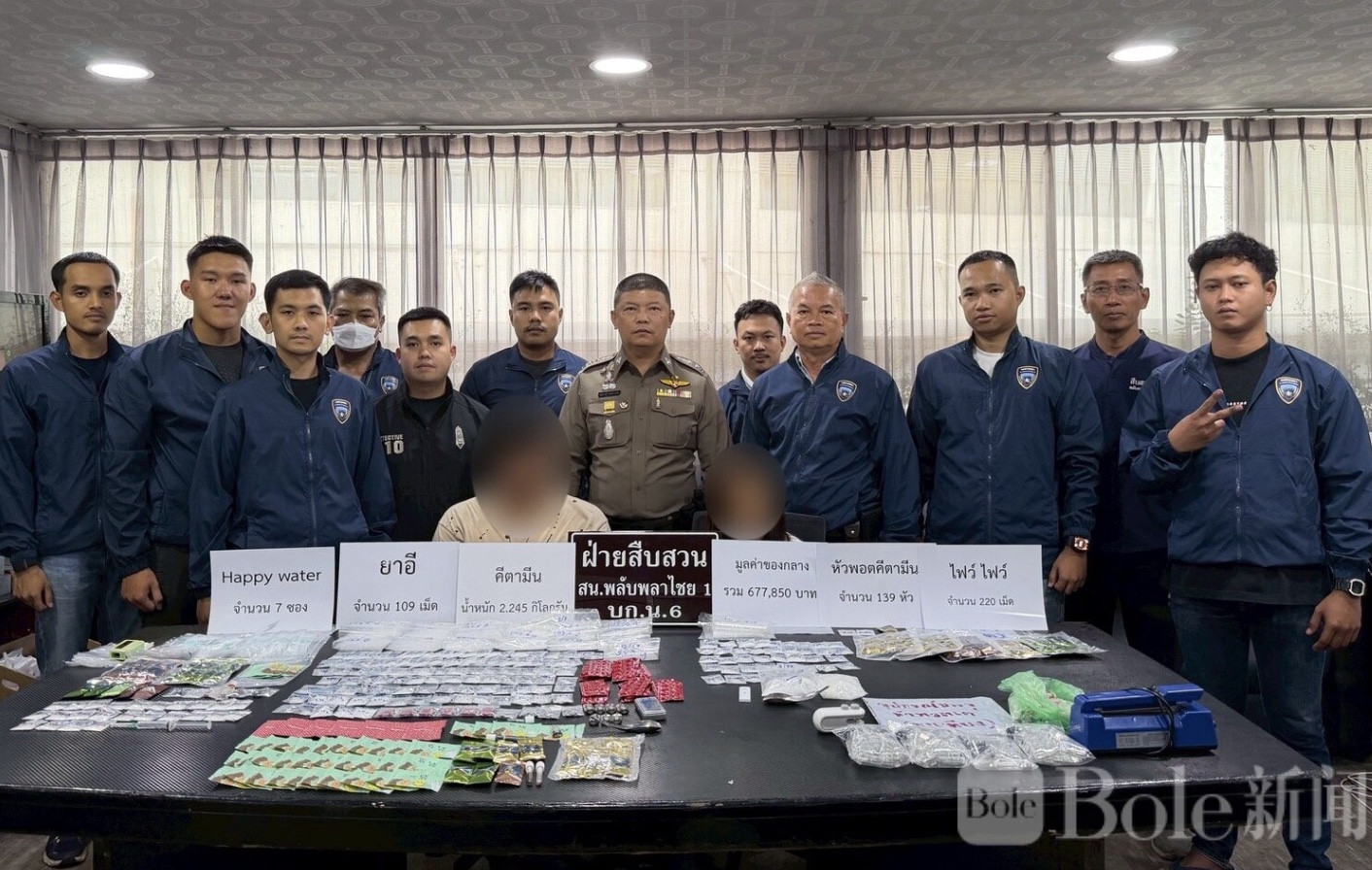 Bole新闻专讯: 曼谷警方近日展开扫毒行动,在普拉普拉乍夜警区成功抓获一对涉嫌贩毒的夫妇,并在其公寓内缴获大量毒品。警方查获的涉案物品包括2.245公斤K他命、139颗电子烟烟弹型“pocky”、7包“快乐水”胶囊、109颗摇头丸及220颗Erimin 5,涉案总价值超过67万泰铢。
