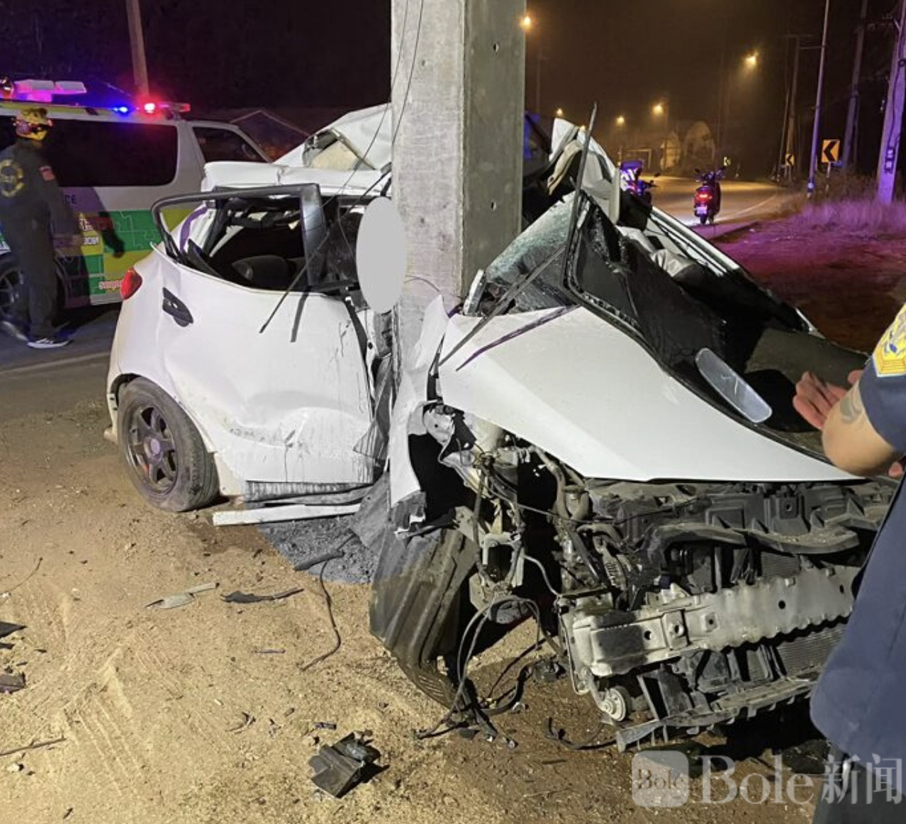 Bole新闻专讯:3月28日凌晨,泰国北部帕夭府发生一起严重交通事故。一辆白色轿车在经过当地一处被称为“死亡弯道”的路段时突然失控,车辆猛烈撞上路边电线杆,整车几乎被撞成废铁。车内一名约30岁的男子被困驾驶座,救援人员赶到时已无生命迹象,当场确认死亡。