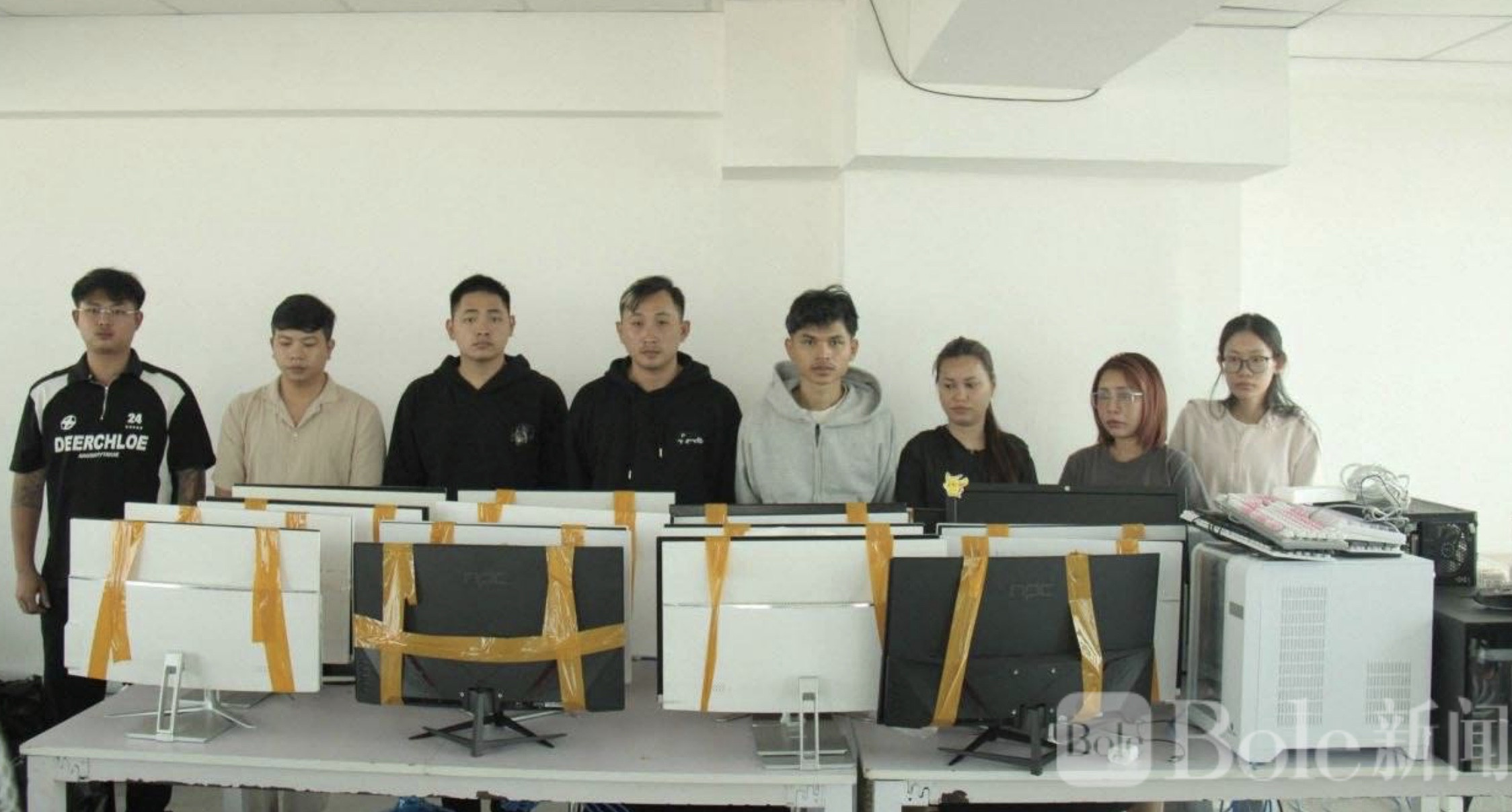 Bole新闻专讯:3月27日下午,金边市执法部门联合军警部队展开快速突击行动,一处隐藏在堆谷区时代广场3号的非法网络赌博窝点被彻底捣毁。行动中,执法人员迅速控制现场,依法逮捕8名涉案人员,包括男女各类工作人员,并当场查获多台用于网络赌博的电脑及相关设备。