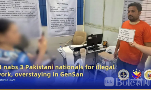 Bole新闻专讯:菲律宾移民局近日在南部城市将军市展开执法行动,抓获3名涉嫌违反移民法规的巴基斯坦籍男子。执法人员称,这几人不仅存在签证问题,还被发现直接参与商业经营活动,目前已被带走接受进一步调查。