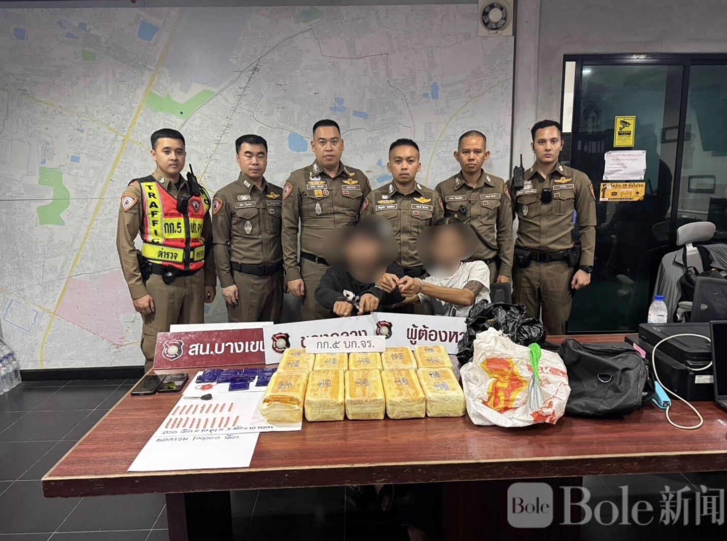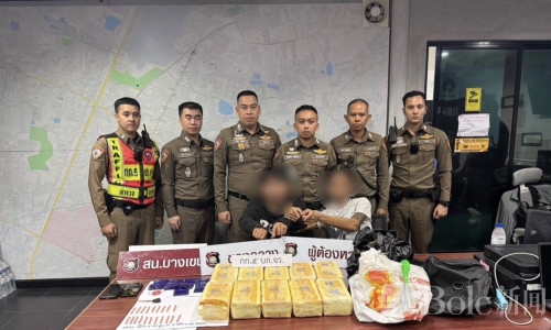 Bole新闻专讯:泰国曼谷警方于2026年3月31日展开路面执法行动,在拉敏特拉路一处酒精检测点附近,当场查获一起重大毒品运输案件,现场缴获约100,000粒毒品,并逮捕两名涉案男子。