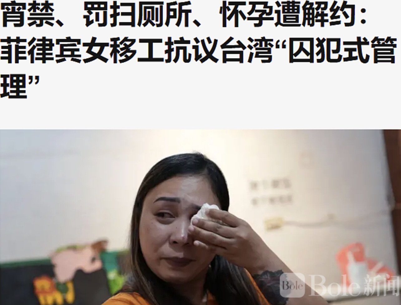 Bole新闻专讯:近日,国际媒体聚焦菲律宾女工在台湾遭遇不当管理与劳动争议,多名女性员工控诉,自己在工作与生活上受到近似“囚犯”的管控,包括宵禁、额外劳动惩罚,以及因怀孕被迫终止合同等问题,引发社会关注。