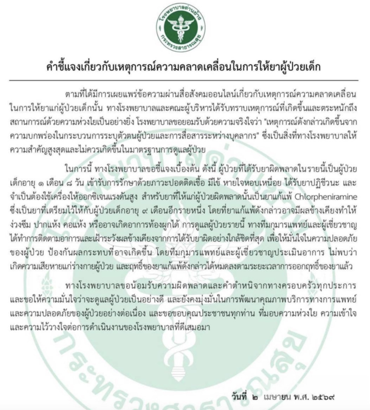 Bole新闻专讯:泰国丹昌医院在4月2日承认在医疗过程中出现用药差错,导致一名1个月零8天的婴儿误注抗过敏药物,但所用药物为针对9个月儿童的抗组胺药,并非成人药。医院强调,此事件源于医护人员在患者身份核对及内部沟通上的疏漏,并非医疗失职。