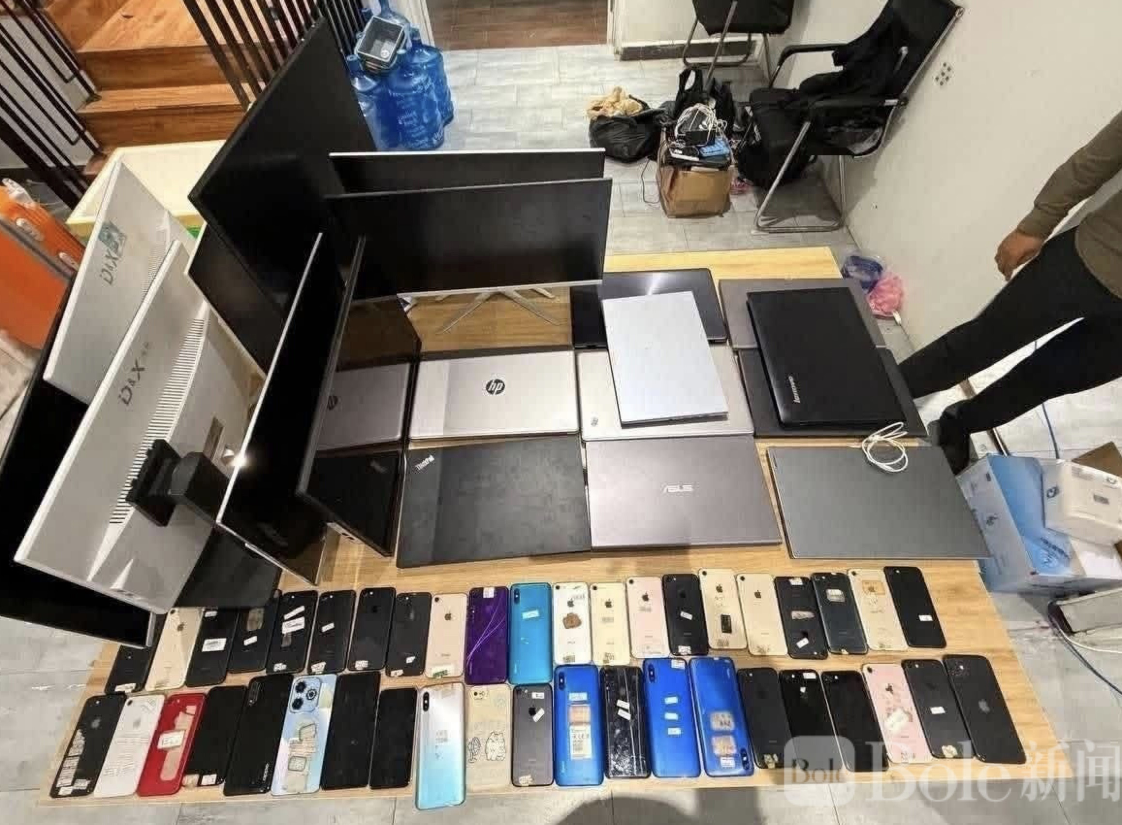 现场查获的电子设备数量也相当惊人:执法人员共扣押89台一体机电脑、57台笔记本电脑、73台iPad、1421部手机,以及打印机、显示器和多个金属储物柜等设备。从规模来看,这里显然不是普通办公场所,更像是一条高度组织化的网络作业线。