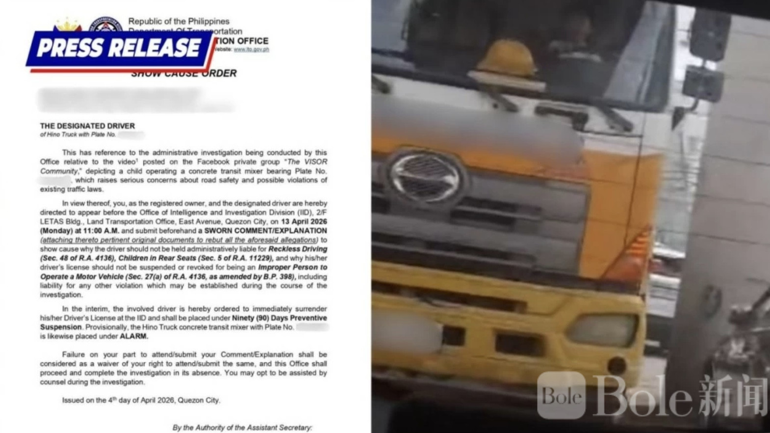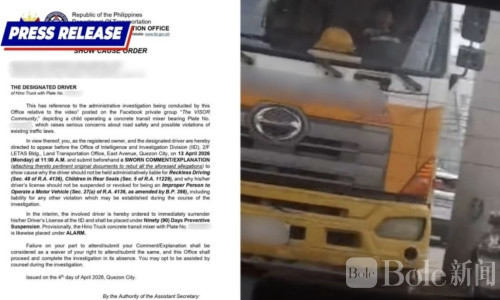 Bole新闻专讯:一段小男孩驾驶混凝土搅拌车的视频在社交媒体上疯传,引发公众对道路安全的高度关注。菲律宾交通管理局(LTO)在黑色星期六(4月4日)迅速回应,对注册司机发出行政调查令,同时暂时吊销其驾照,并将涉事混凝土车列为警示状态,限制使用。