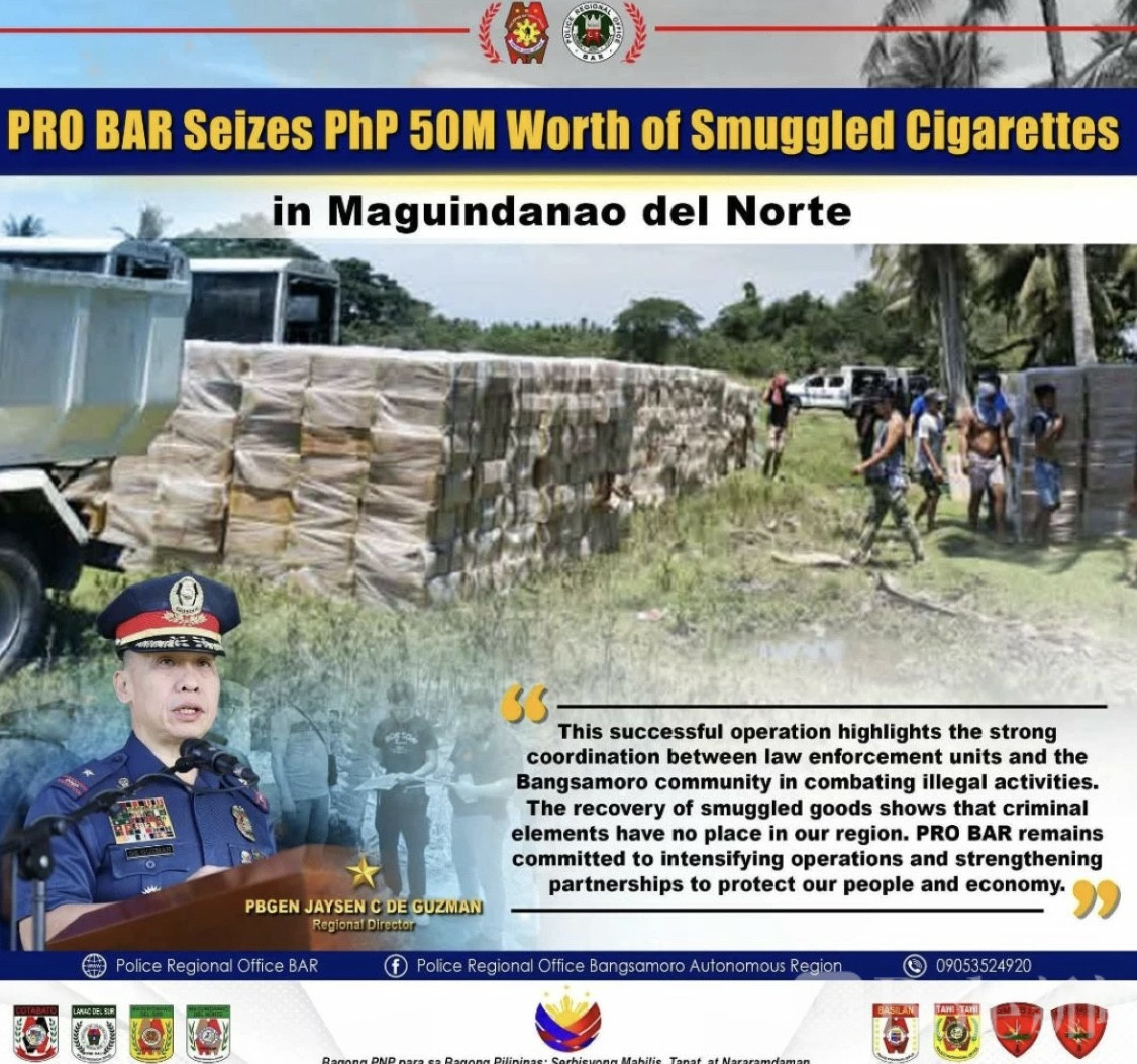 Bole新闻专讯:4月2日圣周“濯足节”当天,菲律宾北马京达瑙省达图·奥丁·辛苏亚特市(Datu Odin Sinsuat)爆出一起重量级缉私行动——警方在Sitio Turugan, Barangay Dinaig Proper查获走私香烟,总价值约5000万披索。此次行动源于一位市民的举报,警方赶到现场发现,1,170箱非法香烟被弃置在河岸附近,无人认领。同时,现场还意外缴获两支M79榴弹发射器。