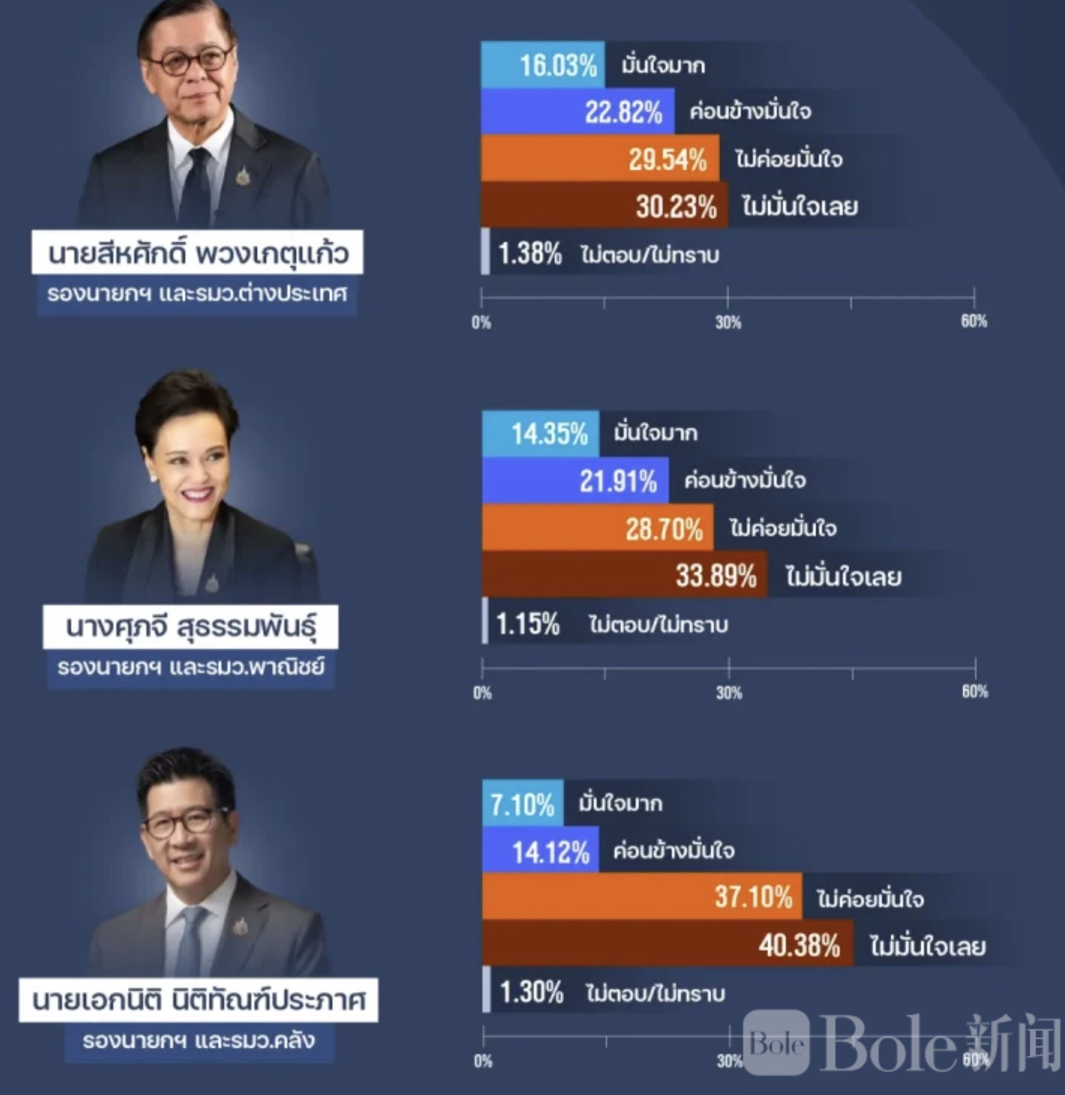 其中,副总理兼外交部长西哈萨的不信任率为30.23%,不太信任29.54%;副总理兼商业部长素帕琪不信任率为33.89%,不太信任28.70%;副总理兼财政部长艾尼迪不信任率高达40.38%,不太信任37.10%,显示公众对财政事务的信心最弱。