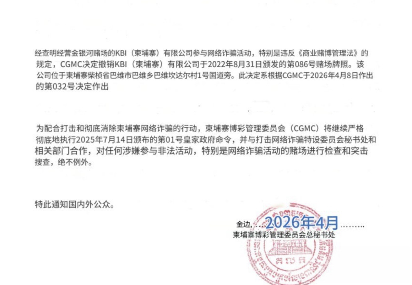 调查显示,金银河赌场由KBI(柬埔寨)有限公司经营,该公司涉嫌技术诈骗及违反《商业博彩管理法》相关规定。基于调查结果,柬埔寨博彩委员会决定撤销KBI公司于2022年8月31日获得的赌场牌照(牌照号086,撤销决定书编号032)。赌场位于巴维市巴维分区巴维坎达尔村1号国道。